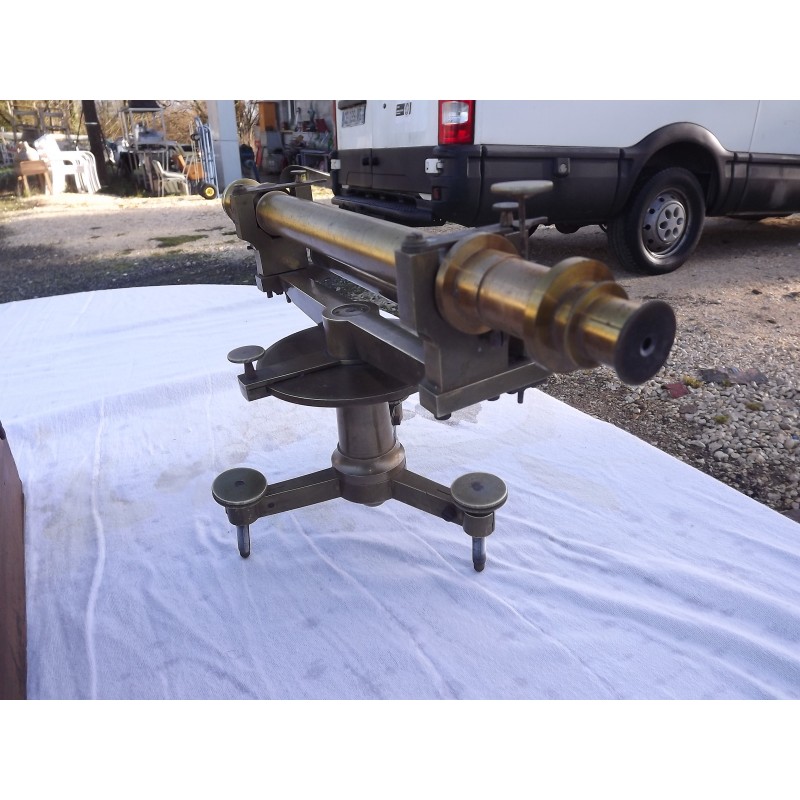 Théodolite Lerebours et Secretan Paris , 19 ème , cuivre et laiton , haut : 21 cm , long et larg : 24 cm sur 15 cm , long lunette : 38 cm , coffret Noyer , haut : 18 cm , long et larg : 40 cm sur 23 cm , poid : 6,6 Kg , trés bon ètat , complet et etat de marche , trés bonne vision de la lunette , bulle niveau présente