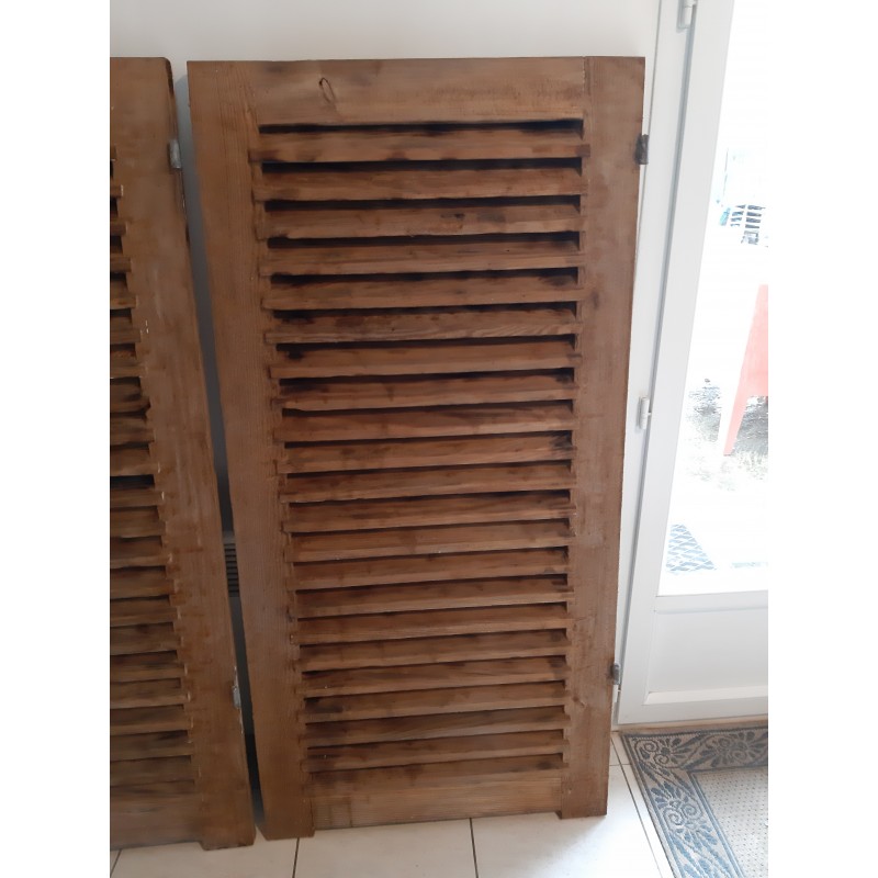 Persiennes Anciennes des Années 60 en Pin , entièrement décapées , haut : 134 cm , long et larg : 66 cm sur 3 cm , l'une , poid : 22 Kg les 2 , trés bon ètat |
