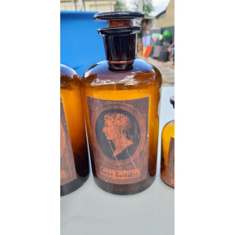 5 Flacons de Pharmacie en verre Marron , 2 : A.Rutae et 1 : Cerat Santalin , Haut : 23,5 cm Diam : 11 cm et 2 Mucum , Haut : 11 cm Diam : 5 cm et Haut : 9,5 cm , Diam : 4 cm , poids Total : 2 Kg , trés bon ètat |