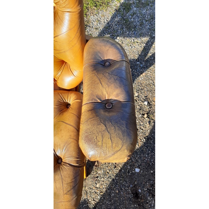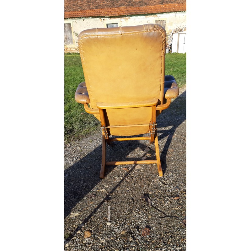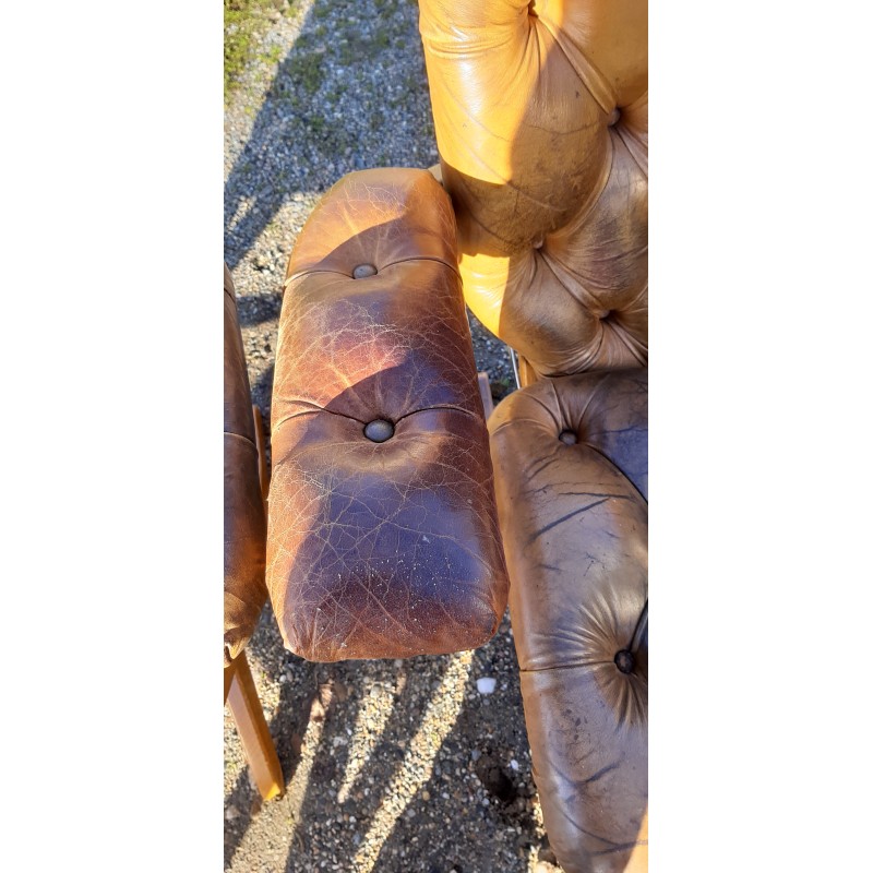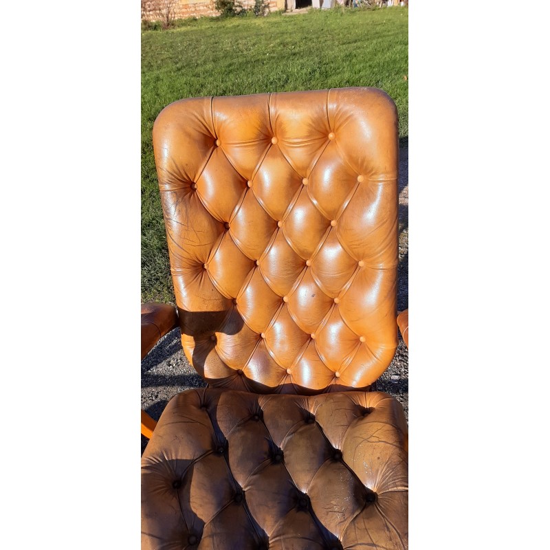 Paire de Fauteuils Cuir de Style Chesterfield , Modulable a 4 Positions , repliables , Bois Hétre , Fer et Laiton , Haut : 103 cm , Haut d'assise : 50 cm , long et larg : 72 cm sur 78 cm , avec un Pouf , lui aussi repliable , le tout est en trés bon ètat , Patine d'Origine !