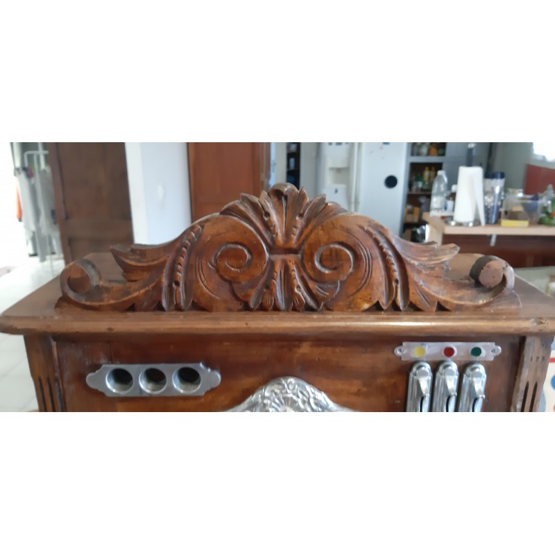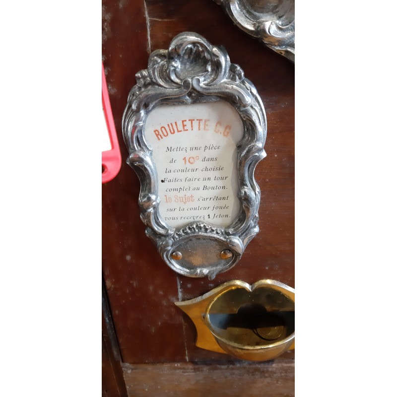 | Jeu Ancien La Roulette Nouvelle par Constant Georg 1912 , Inserez une pièce de 25 centimes dans la couleur choisie, tournez la poignée. Si la roultte s'arrête sur votre couleur, vous gagnez un jeton de consommation de la valeur indiquée. Haut : 74 cm , long et larg : 50 cm sur 20 cm , trés bon ètat d'aspect et de Fonctionement |