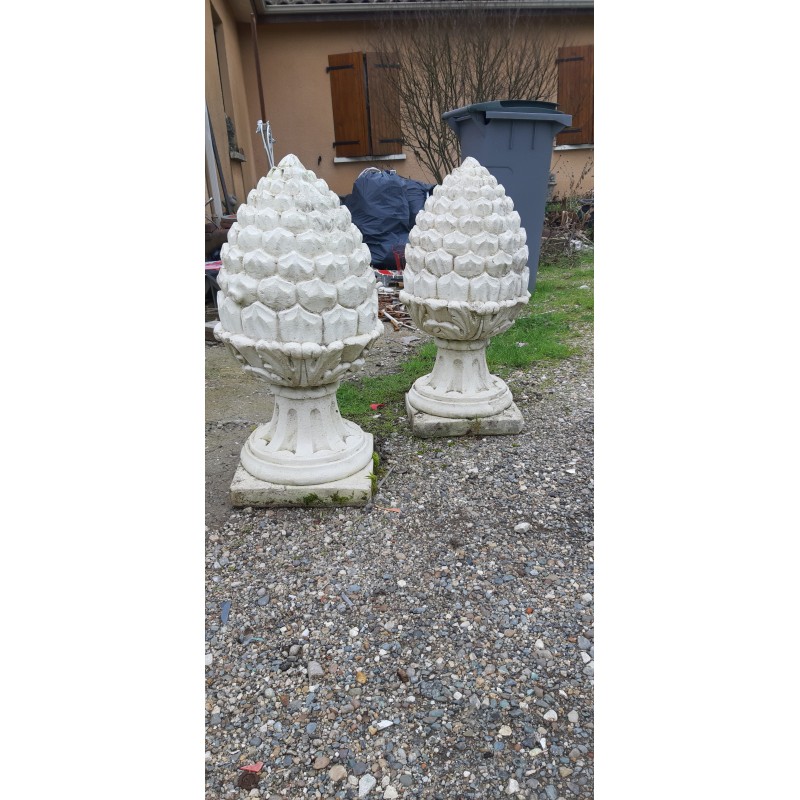 Trés Grand Modéle de Paire de Pignes de Pin en Pierre Reconstituées , Haut 70 cm , long et larg : 33 cm sur 33 cm , poids : 100 Kg pièce , Bon ètat , trés belle Patine du Temps |