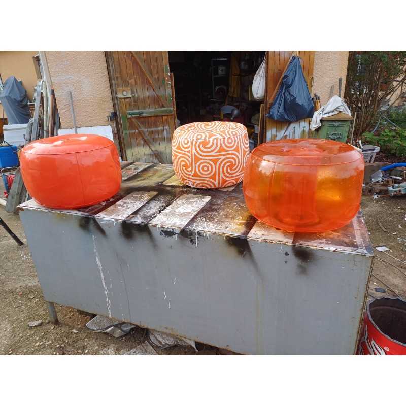 3 Poufs Vintage Gonflables en Plastic Orange , Haut : 32 cm , Diam : 43 cm , trés bon ètat , sauf le multicolore qui fuit |