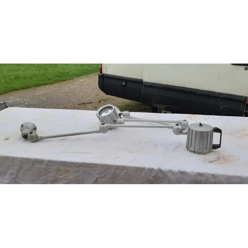 Paire de Lampes JIELDE , 2 Bras , Métal , Alu , Verre , 40 cm par bras , longueur totale : 112 cm , Diam verre : 12,5 cm , poids : 2 Kg pièce , trés bon ètat mais dans leurs jus |