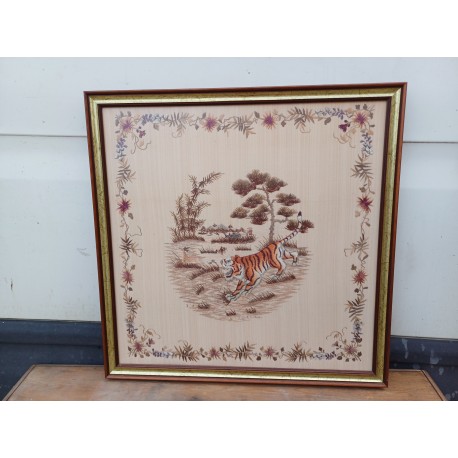 Soierie Asatique Ancienne Tissage sur Soie , Cadre bois , Vitre Plastic , Dimensions : 66 cm sur 66 cm , épaisseur : 3 cm , poids : 3,5 Kg , trés bon ètat , |