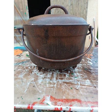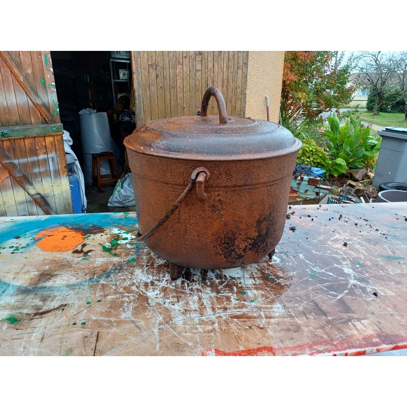 Marmite en Fonte Ancienne , Haut : 46 cm avec couvercle , Diam Intérieur : 44 cm , Profondeur : 30 cm , poids : 23 Kg , trés bon ètat , |
