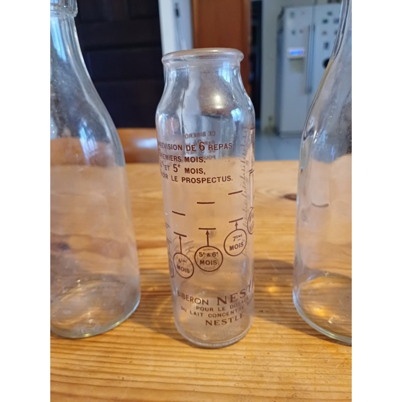 3 Bouteilles de Lait Anciennes , 1 Biberon Nestlé , Haut : 17 cm , Diam : 5 cm , paire de Bouteilles de Lait 1/2 L en verre , Haut : 21 cm , Diam : 7 cm , poids Total : 1 Kg , trés bon ètat