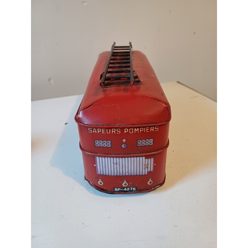 2 Jouets Anciens en Tole , Tracteur Haut : 8 cm , long et larg : 15 cm sur 9 cm , poids : 350 g , Remorque , Haut : 7 cm , long et larg : 18 cm sur 9 cm , poids : 180 g et Camion de Pompier Haut : 13 cm , long et larg : 31 cm sur 10 cm , Bon ètat dans leurs jus