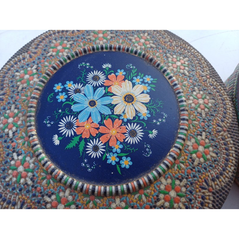 2 Boites Métal Sérigraphiées 1930 , Haut : 8 et 7 cm , Diam : 21 et 19 cm , poids Total : 600 g , en l'état