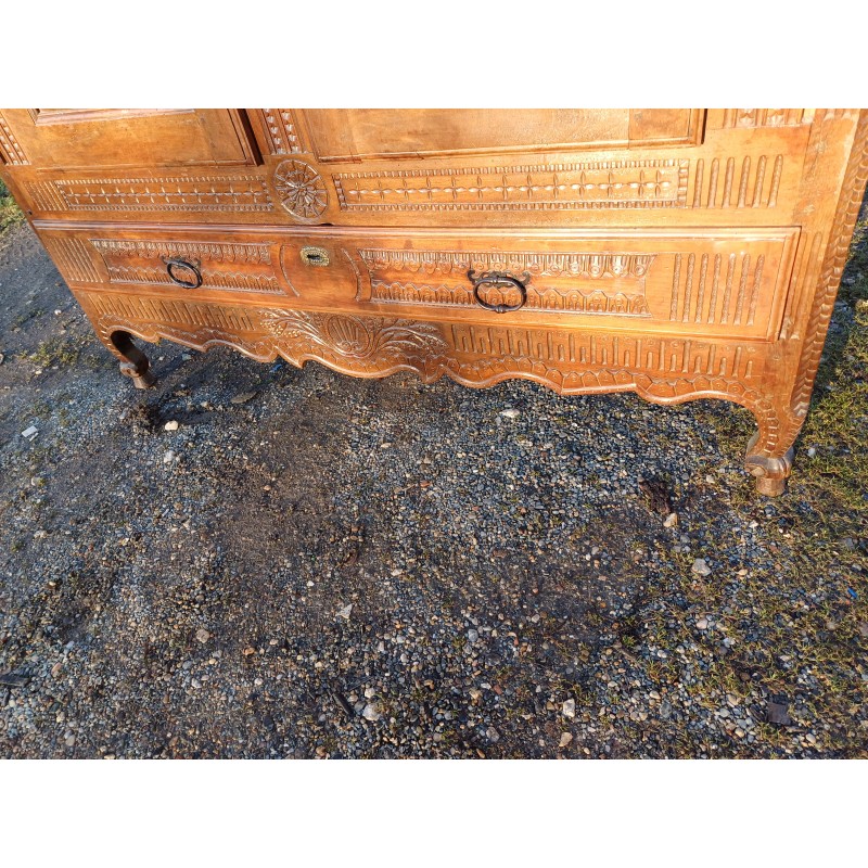 Armoire 3 Portes , 1 Tiroir , Noyer 19 éme , 1 Porte sur le coté gauche avec rangements étagéres , Haut : 232 cm , long et larg : 150 cm sur 48 cm , Profondeur Intérieure : 40 cm , trés bon ètat