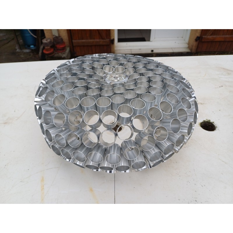 Suspension Vintage Aluminium + verre , Haut : 17 cm , Diam : 40 cm , Cabochon central en verre , poids : 1,540 Kg , trés bon ètat