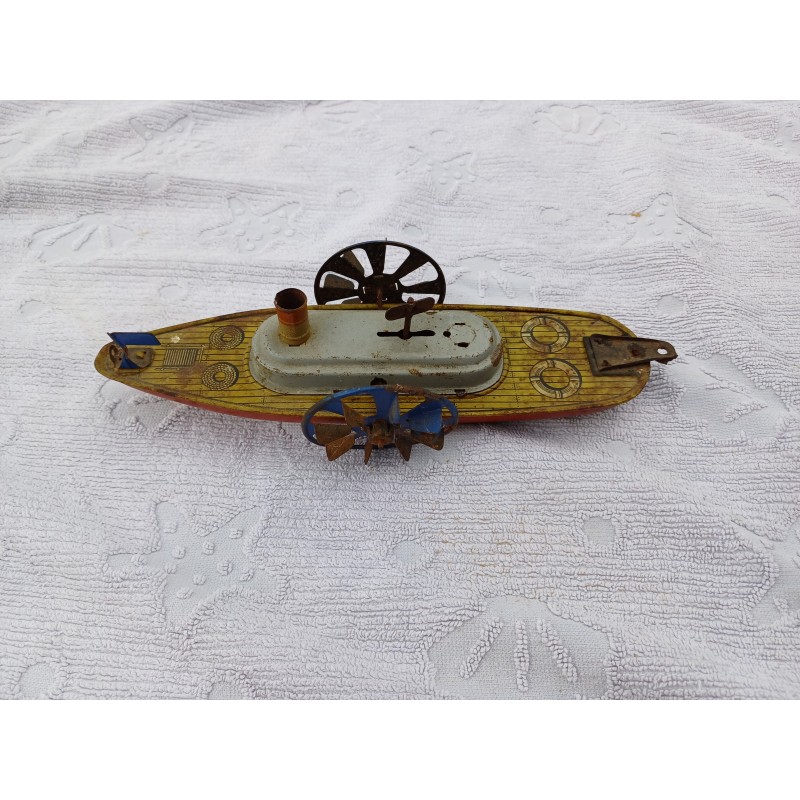 Jouet Ancien Bateau à Roue D.R P.A Germany , Tole , a Clef Remontoir , Marque : R.R.P.A Germany , Haut : 7 cm , long et larg : 26 cm sur 10 cm , poids : 100 g , en l'etat mais en etat de fonctionement