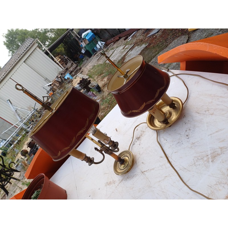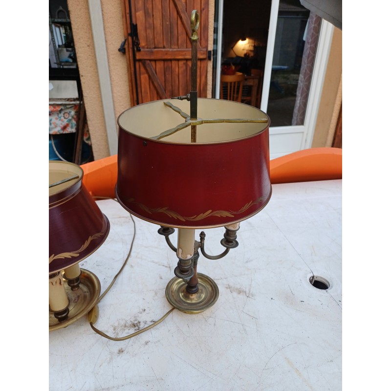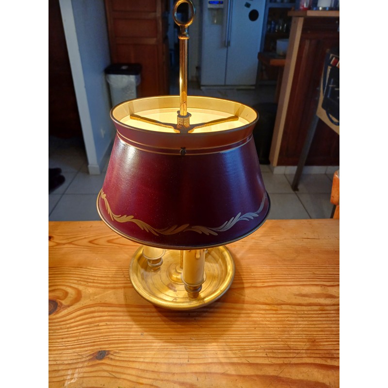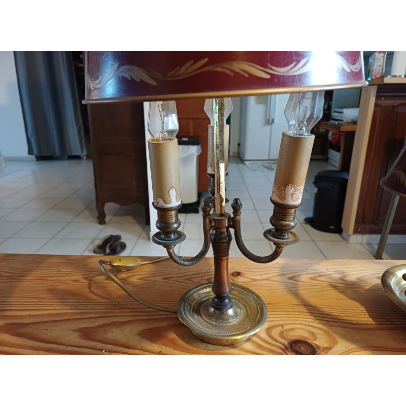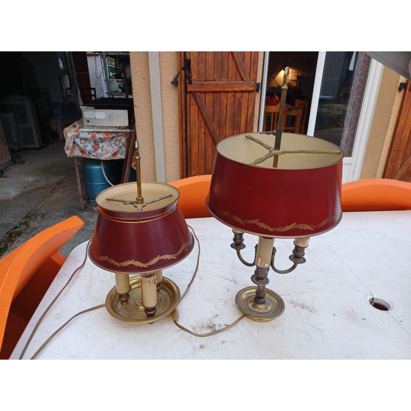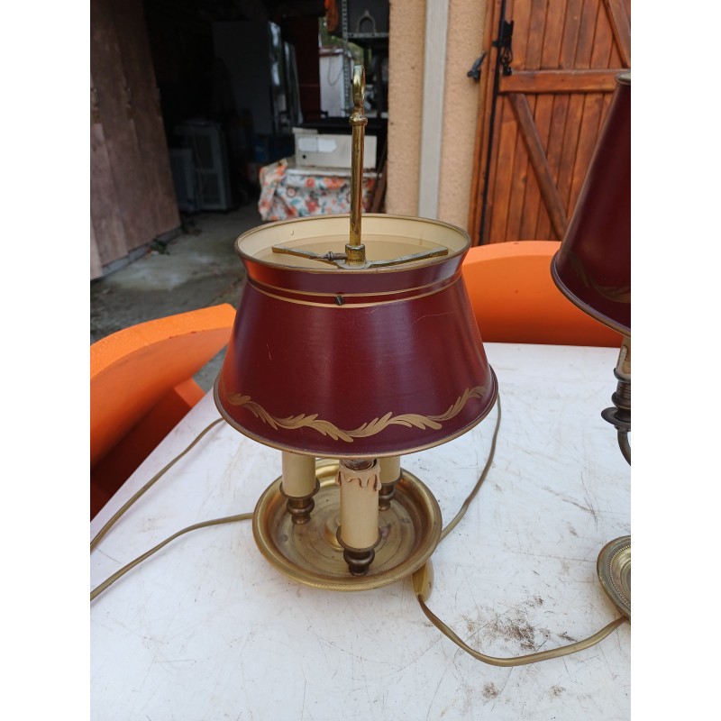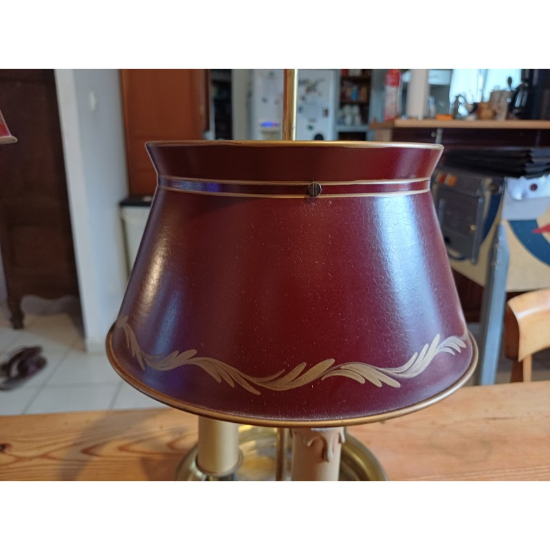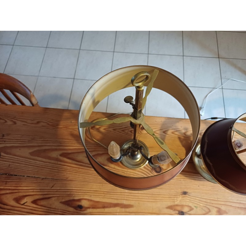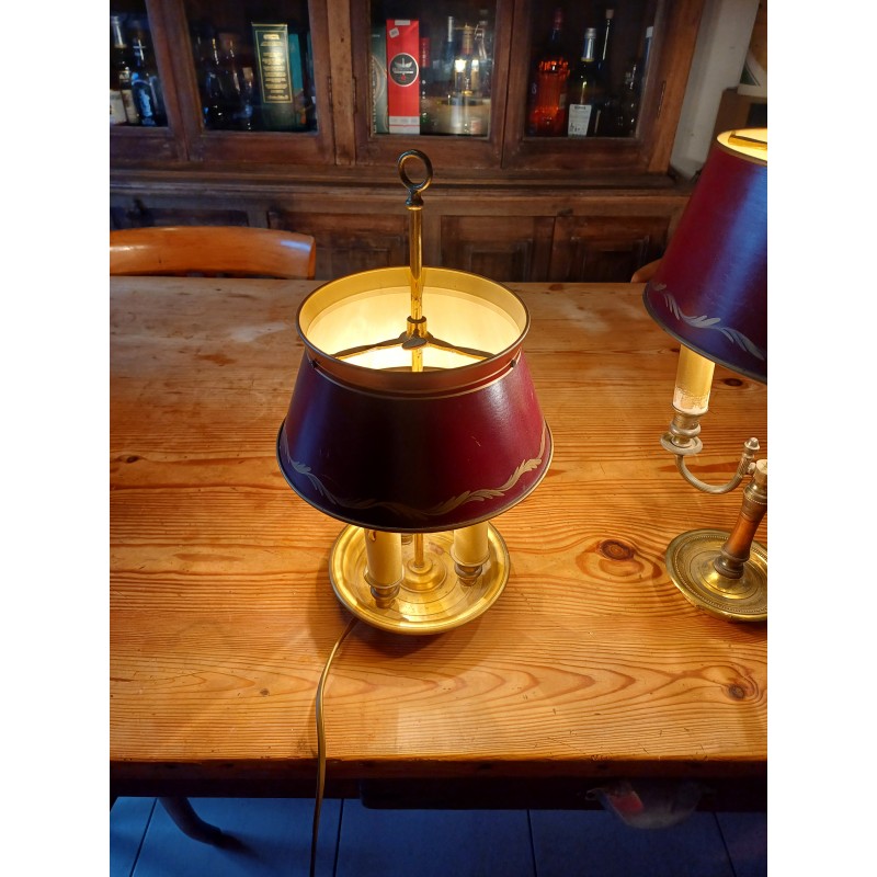 2 Lampes Bouillotte de Style Empire , Laiton et Tole Bordeaux , Haut : 52 cm Diam : 26,5 cm , poids : 1,8 Kg et Haut : 39 cm , Diam : 21 cm , poids : 1,2 Kg , trés bon ètat
