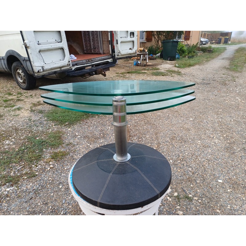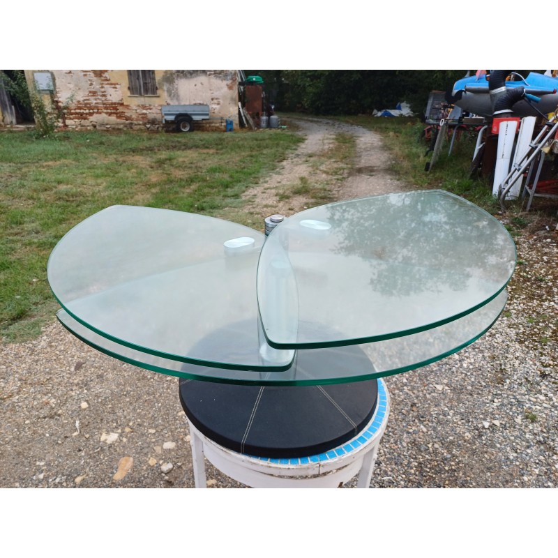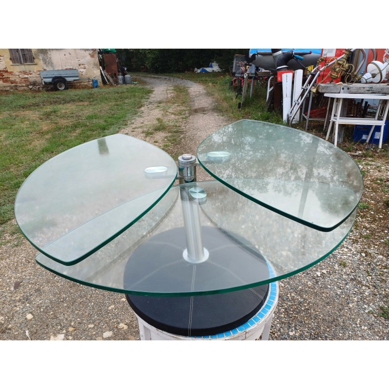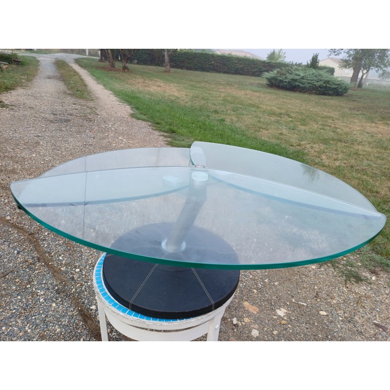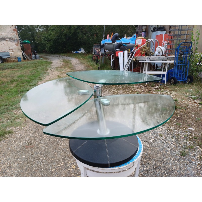 Table Basse Verre Trempè , Chrome et Cuir , " Ligne Roset " Année 70/80 , Haut : 46 cm , Diam : 110 cm pétales ouvertes , long et larg pétales : 91 cm sur 50 cm , épaisseur : 1 cm , 3 Pétales Pivotantes , poids : 100 Kg , trés bon ètat , acheté par l'ancien proprietaire dans les Années 70/80 à Bordeaux Mérignac