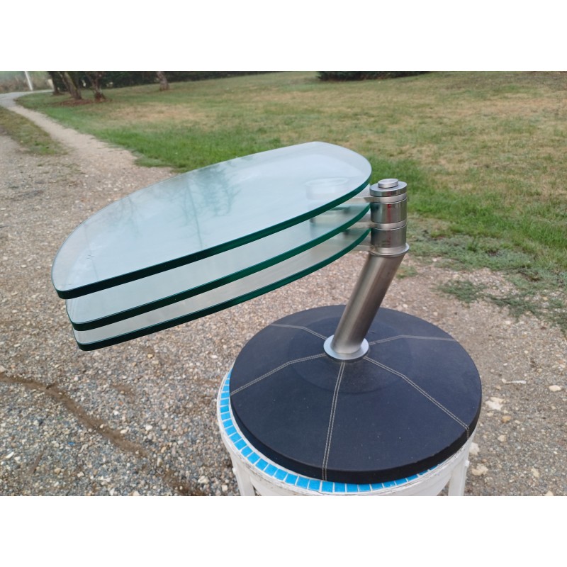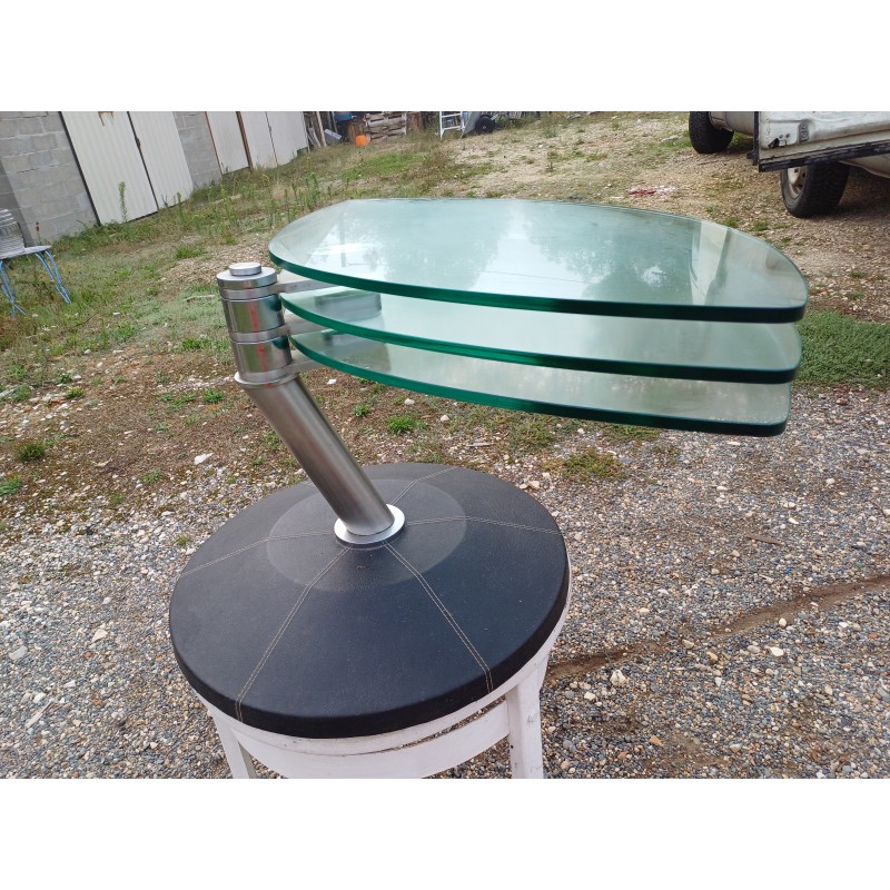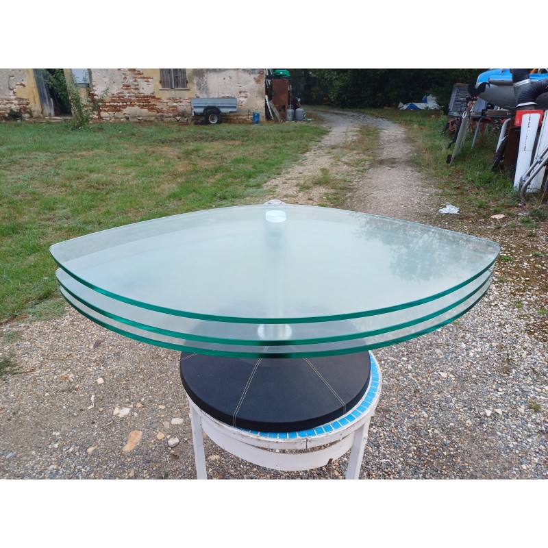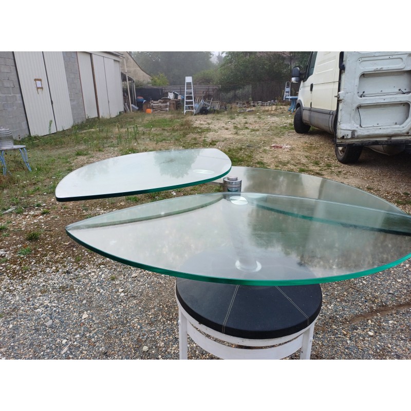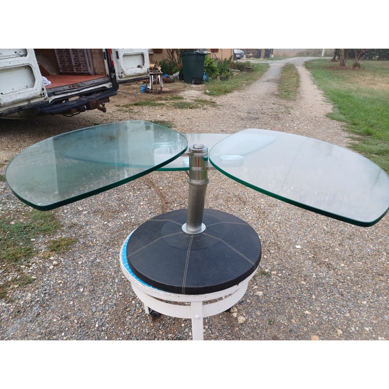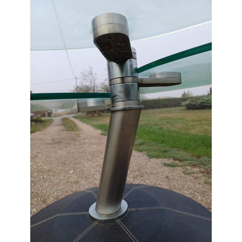 Table Basse Verre Trempè , Chrome et Cuir , " Ligne Roset " Année 70/80 , Haut : 46 cm , Diam : 110 cm pétales ouvertes , long et larg pétales : 91 cm sur 50 cm , épaisseur : 1 cm , 3 Pétales Pivotantes , poids : 100 Kg , trés bon ètat , acheté par l'ancien proprietaire dans les Années 70/80 à Bordeaux Mérignac