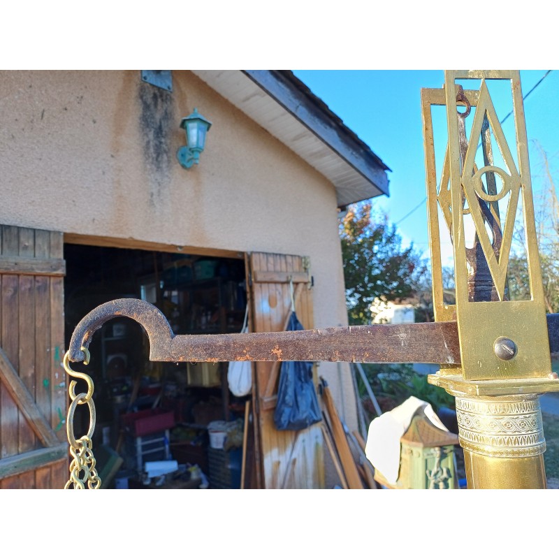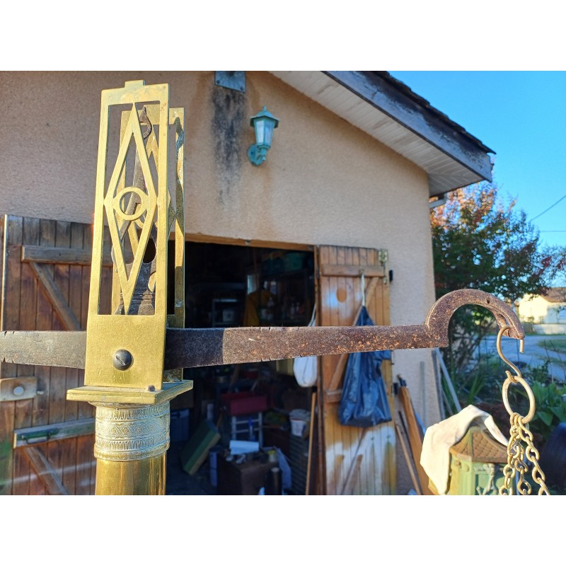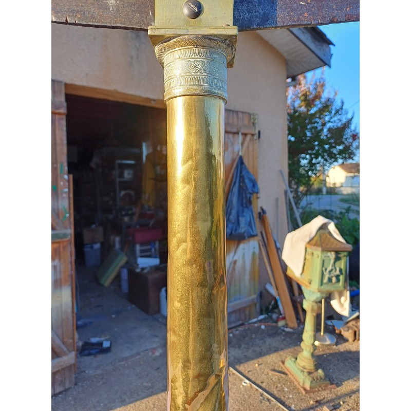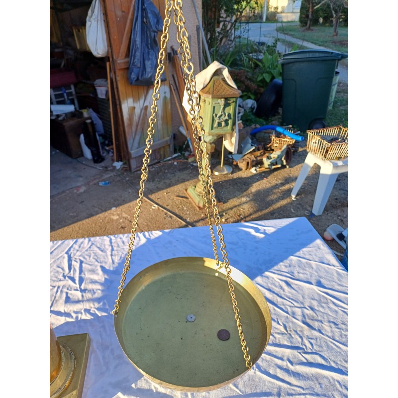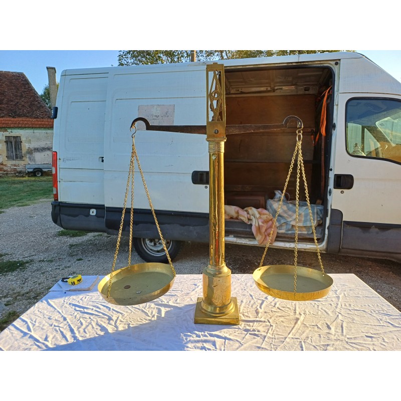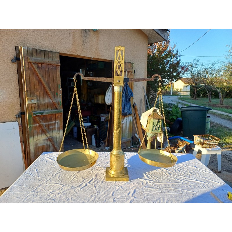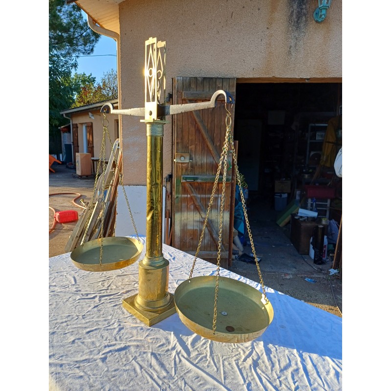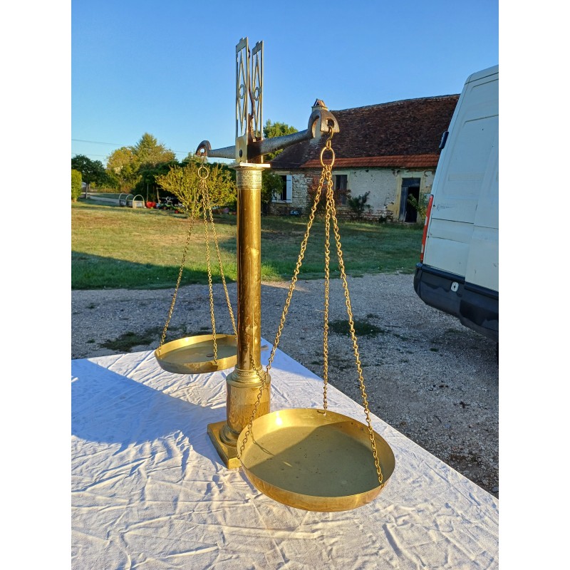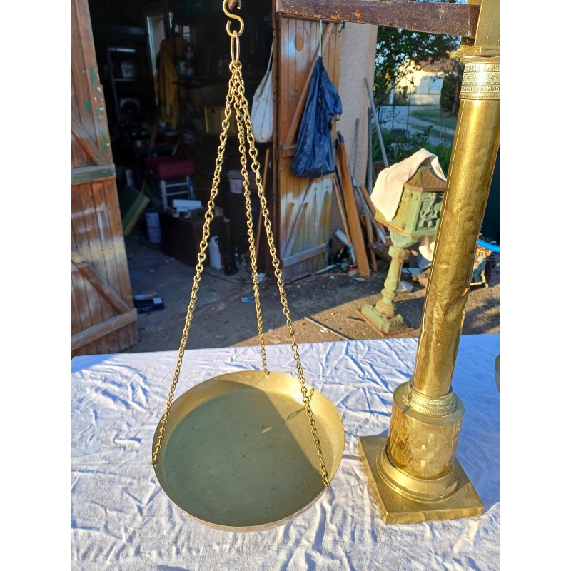 Balance de Magasin 1900 Laiton , Bronze et Fer , Haut : 100 cm , Diam plateau : 32 cm , Diam socle : 18 cm , poids : 11 Kg , trés bon ètat ,