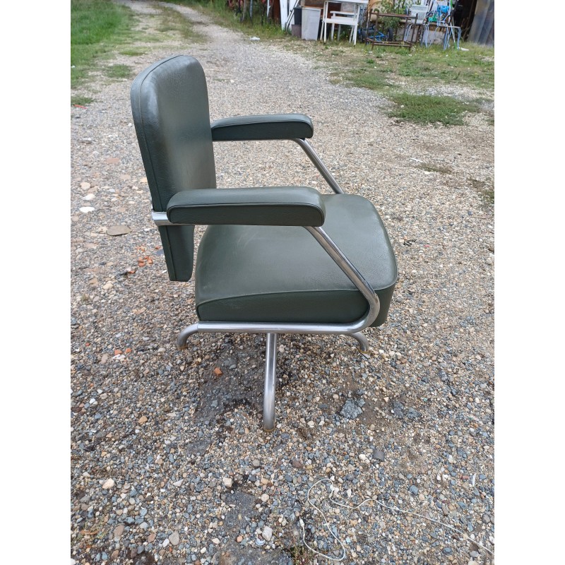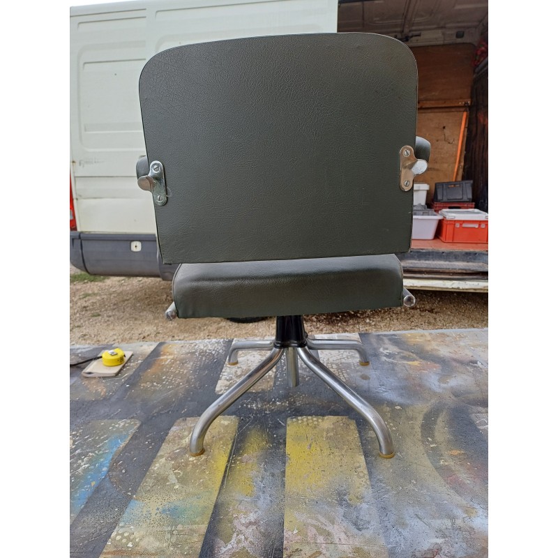 Fauteuil Pullman Métal Chromé et Skai Vert Haut : 79 cm , Haut d'assise : 43 cm , long et larg : 55 cm sur 58 cm , poids : 15 Kg , réglage en Hauteur , pivote , trés bon état mais petit accroc sur un des accoudoirs sur droite , voir dernière photo