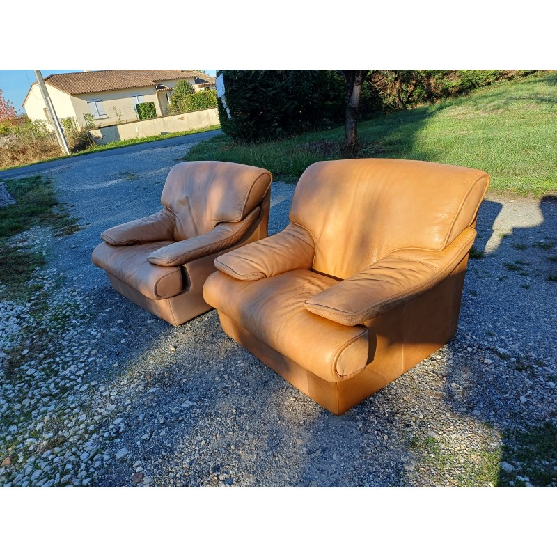 Paire de Fauteuils Vintage en Skai Marron Clair , Haut : 82 cm , Haut d'assise : 38 cm , long et larg : 100 cm sur 110 cm , entiérement déhoussables , trés bon état