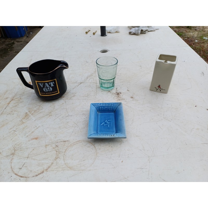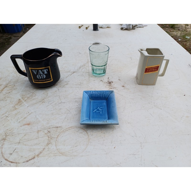 4 Objets Publicitaire de Bistrot des Années 50 , 1 Pichet Vat 69 Haut : 12,5 cm , long et larg : 18 cm sur 11 cm , 1 Pichet Johnnie Walker Haut : 12,5 cm long et larg : 12 cm sur 7 cm , 1 Cendrier Gauloise Haut :2,5 cm , long et larg : 14 cm sur 10,5 cm et 1 Verre Bacardi , Haut 11 cm , Diam : 8 cm , le tout en trés bon ètat