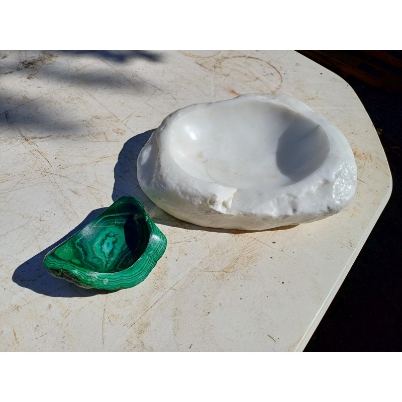 2 Cendriers ou Vide Poche Marbre Blanc Haut : 6 cm , long et larg : 24 cm sur 20 cm , Poids : 3,6 Kg et Malachite , Haut : 4,5 cm , long et larg : 10,5 cm sur 8 cm , poids : 400 g , Trés bon ètat