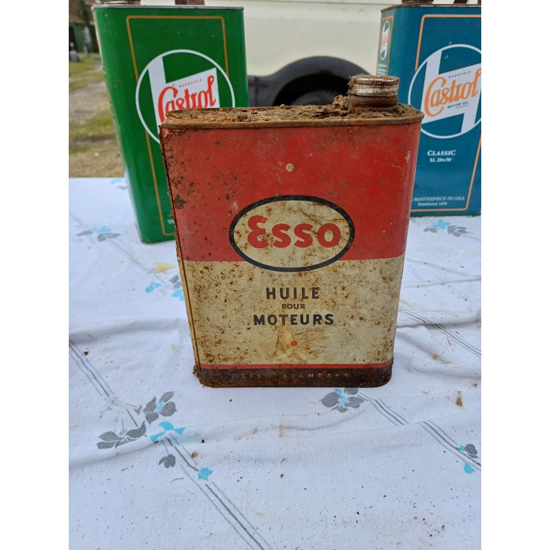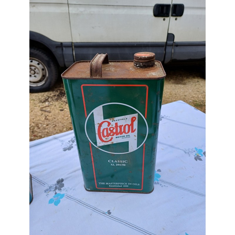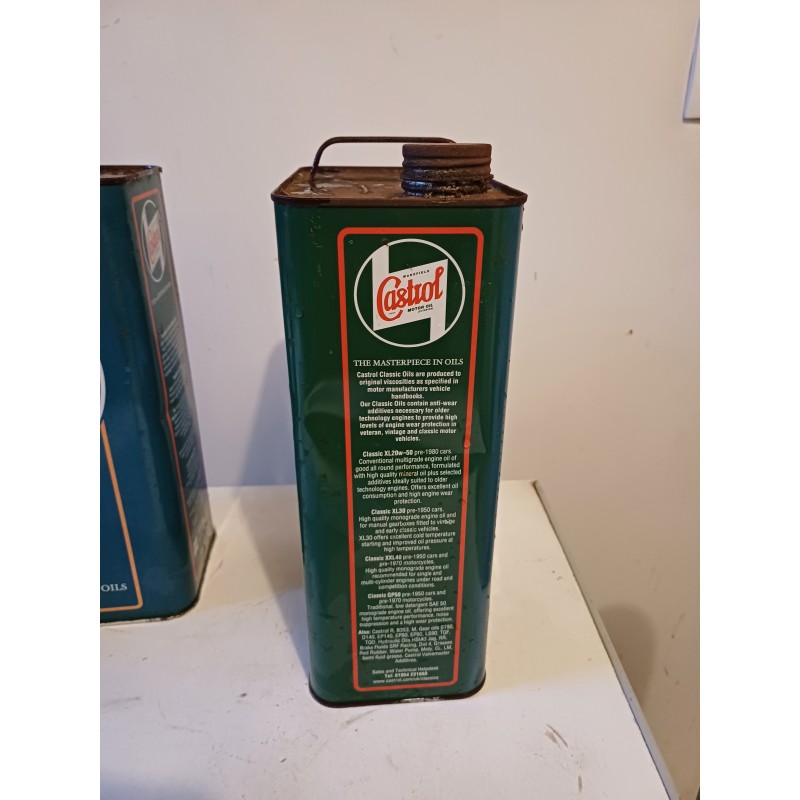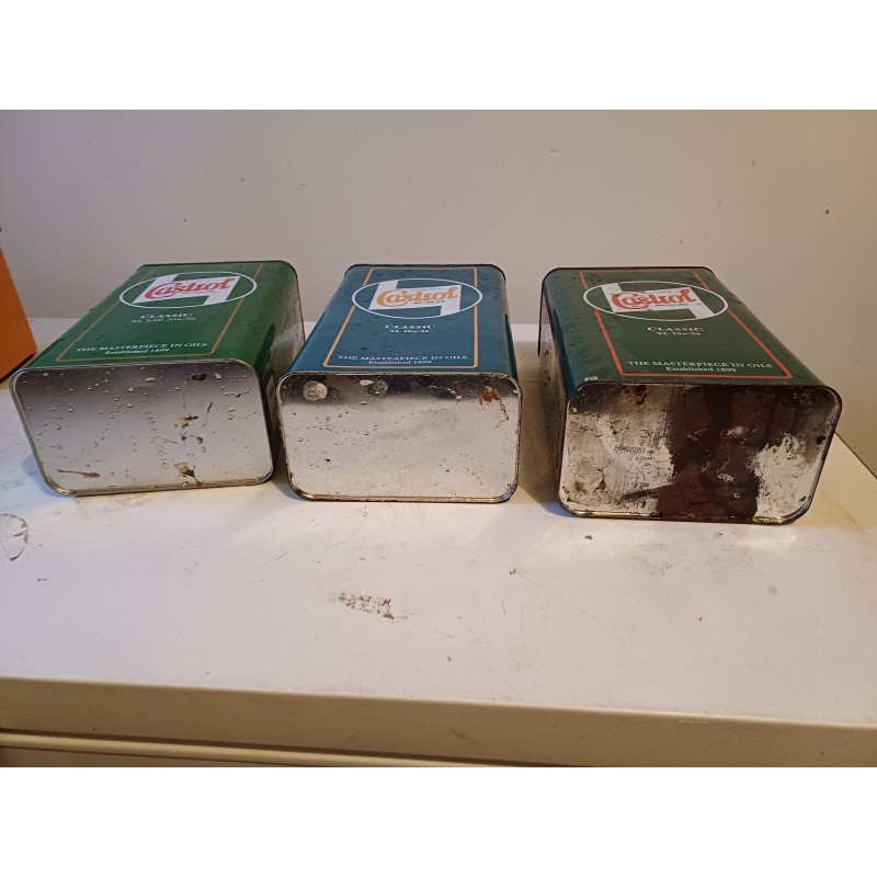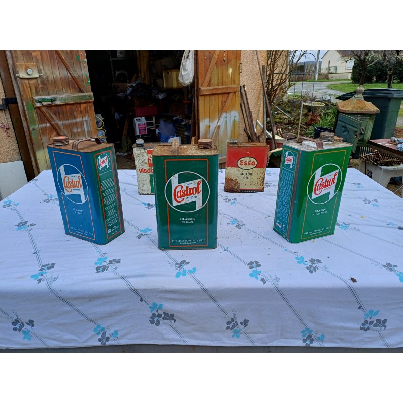 Lot de 7 Bidons d'Huile " Castrol " 2 Couleurs , Classic XL 20/50 , Haut : 31,5 cm , long et larg : 18 cm sur 11 cm , tSolexine , Esso , Super Visco Static et Iseki , Haut : 23 cm , long et larg : 16 cm sur 7 cm , poids Total 3 Kg , en l'état d'origine