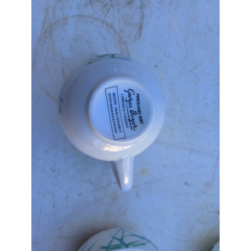 Service en Porcelaine de Limoges " Georges Boyer " 6 Tasses et Sous Tasses , 1 Thière Haut : 14 cm , Long et larg : 23,5 cm sur 15 cm , , 1 Pot à Lait , 1 Pot à Sucre , poids Total : 2,7 Kg , trés bon ètat