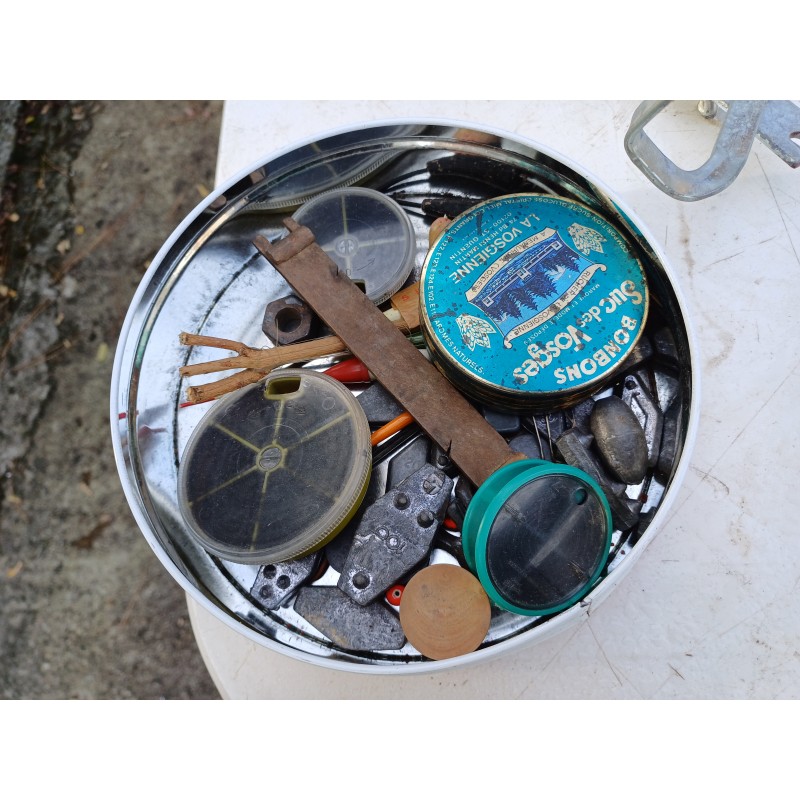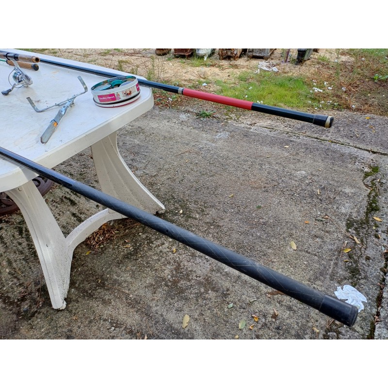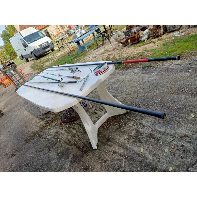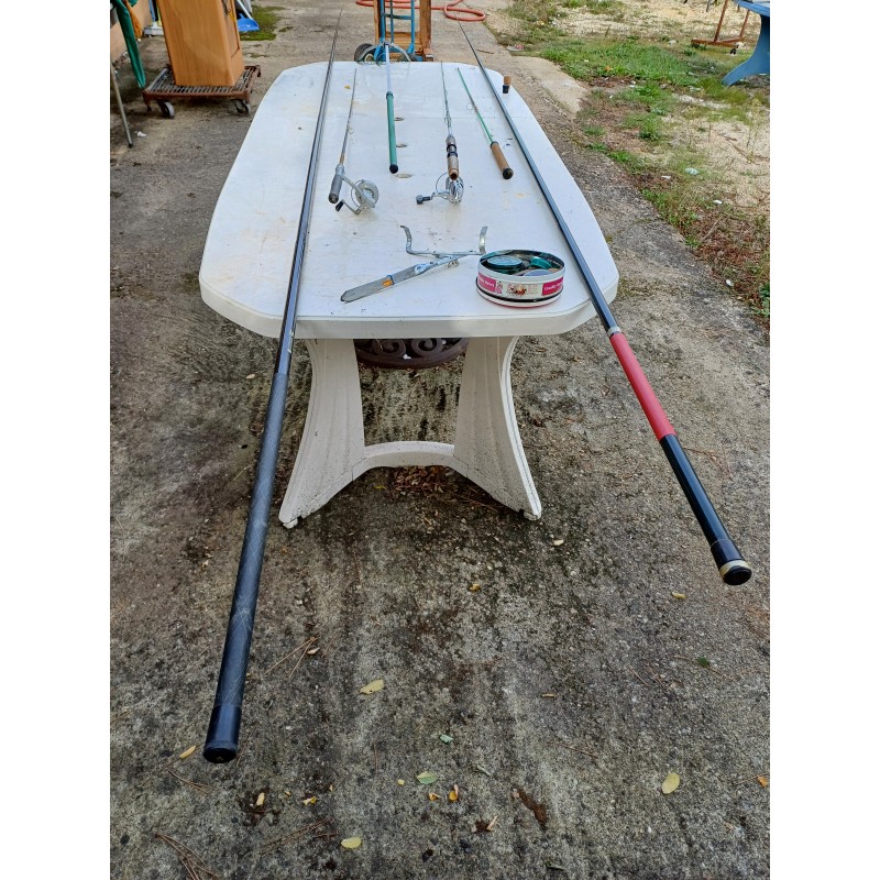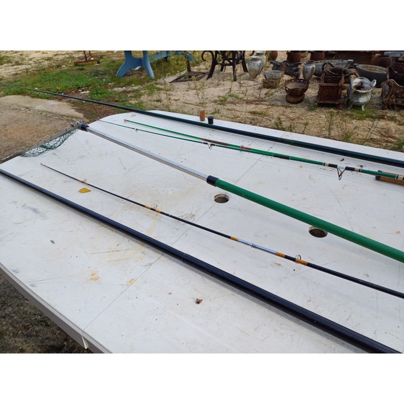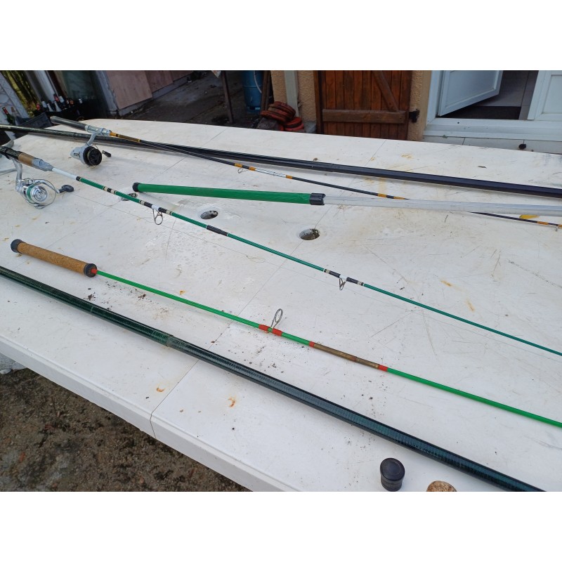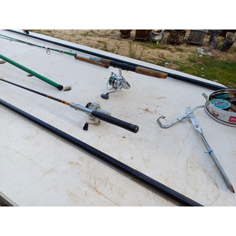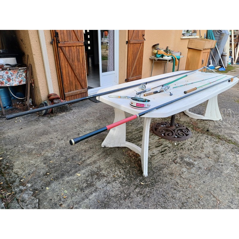 Lot de Cannes à Péches , Moulinets , épuisette , Poids et Plantoir a Cannes , Cannes de : 5 Métres , 2 de 3 et 1 de 1 Métre 30 , Moulinets : Miciels et Sweepfire E2500 , le tout est en trés bon état