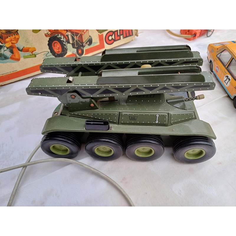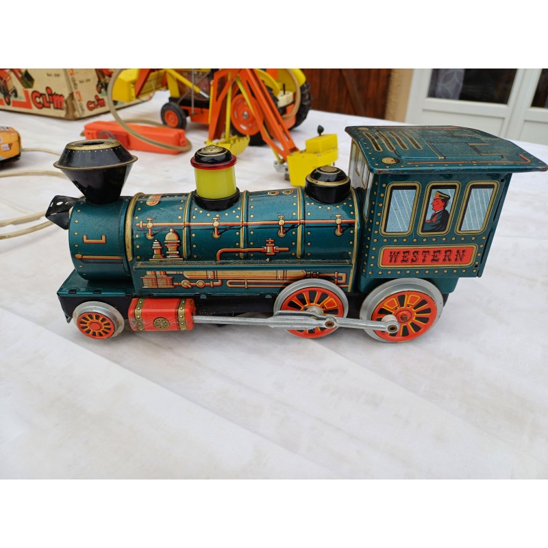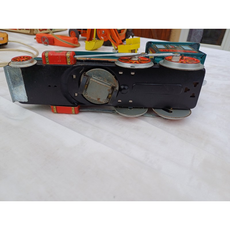 Lot de Jouets Anciens des Années 50 en Tole , Jouet ancien en tole Locomotive à Piles , Jouet ancien en tole Joustra Engin Lance Missilles Militaria , Jouet Ancien Tracteur Yumbo Retro excavado electrica , Pelle Rétro , Ref : 209 , Haut : 18 cm , long et larg : 43 cm sur 15,5 cm , poids : 2,2 Kg , à Piles , Fonctionne , Boite légérement déchirée , bon ètat Général ,