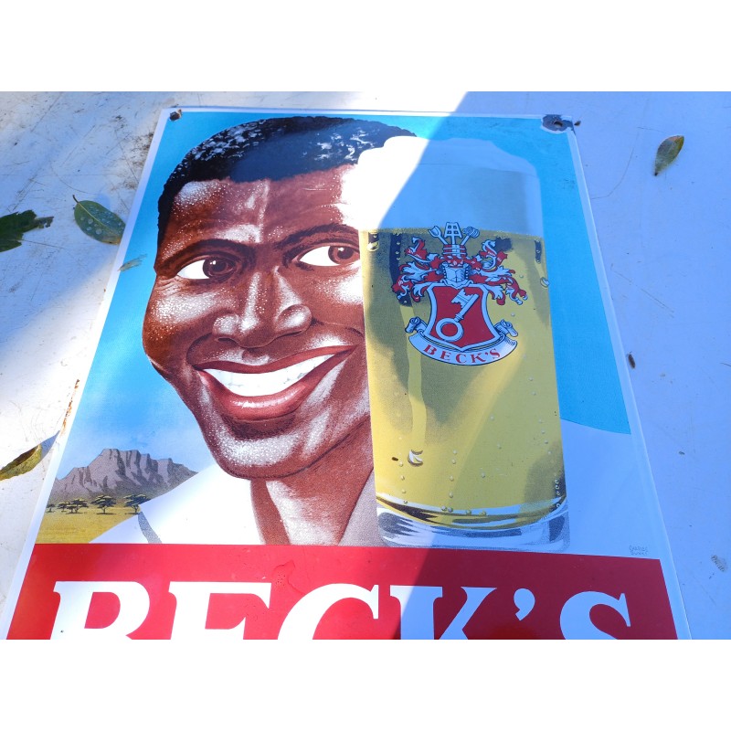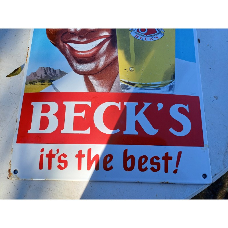 Plaque émaillée Beck's Biére Allemande , semi Bombée , long et lar : 40 cm sur 27 cm , Poids : 1,2 Kg , trés bon état , Rare Plaque Allemande