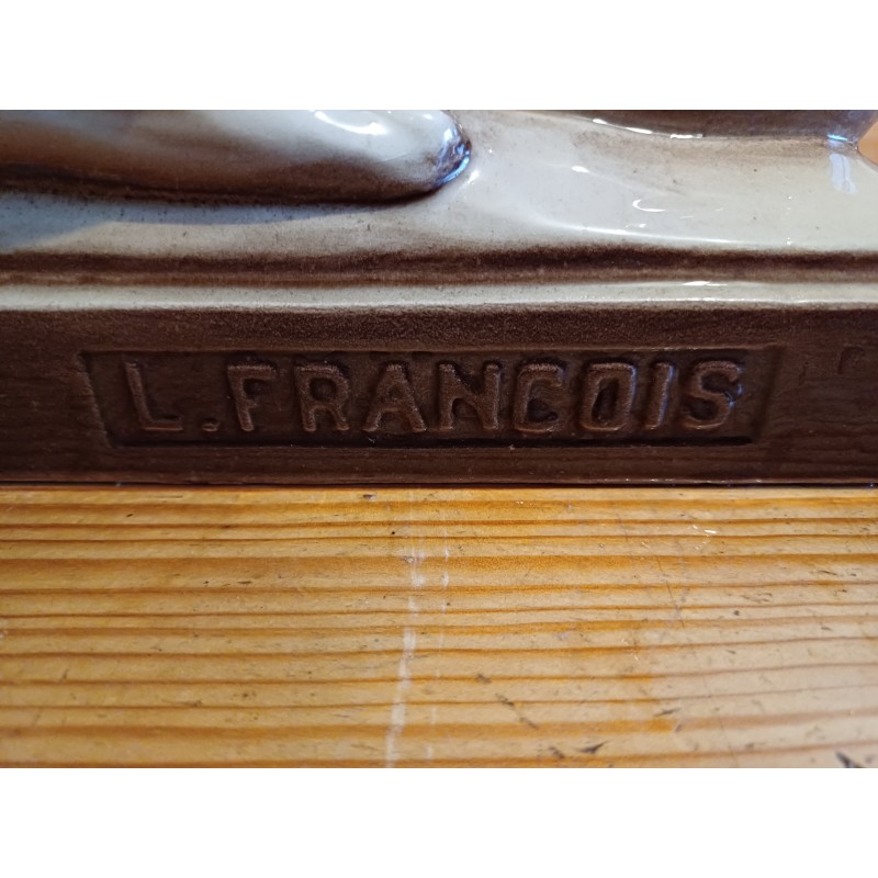 Faience " Chien " de : L.François , Haut : 23 cm , long et larg : 40 cm sur 10 cm , poids : 1,7 Kg , trés bon ètat