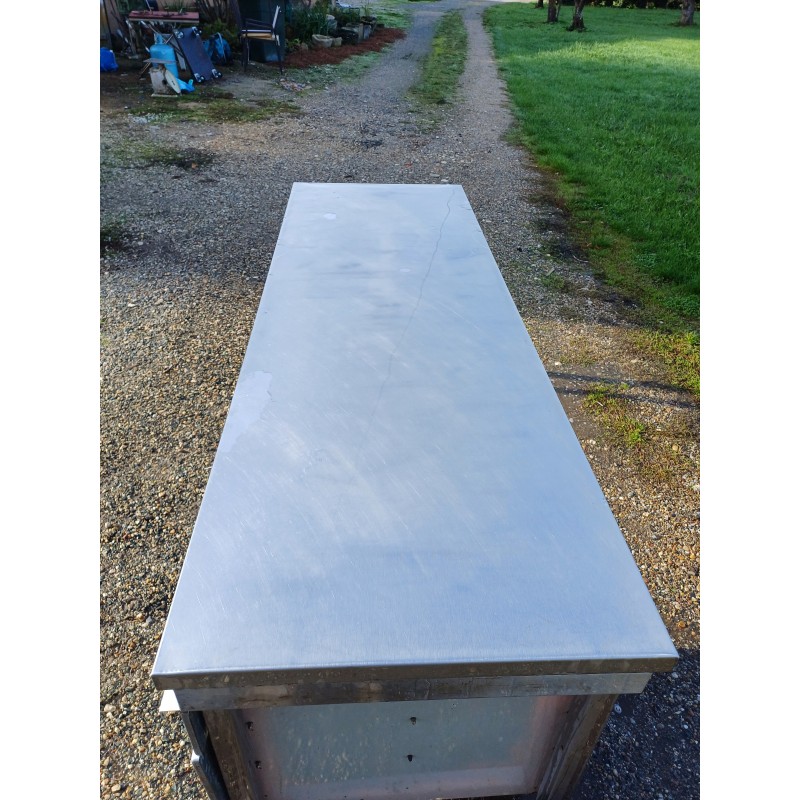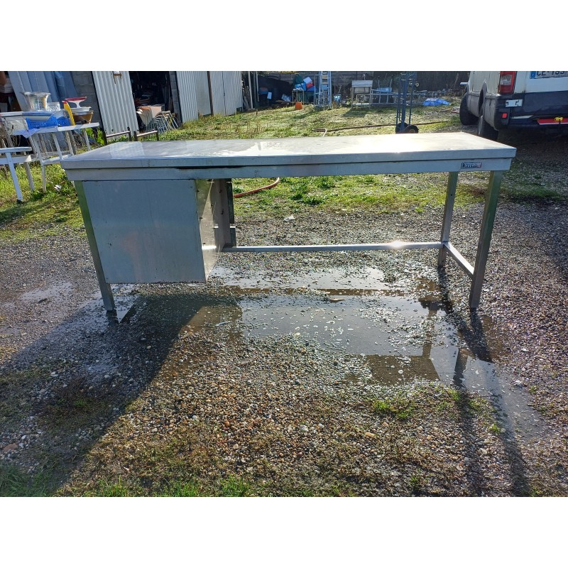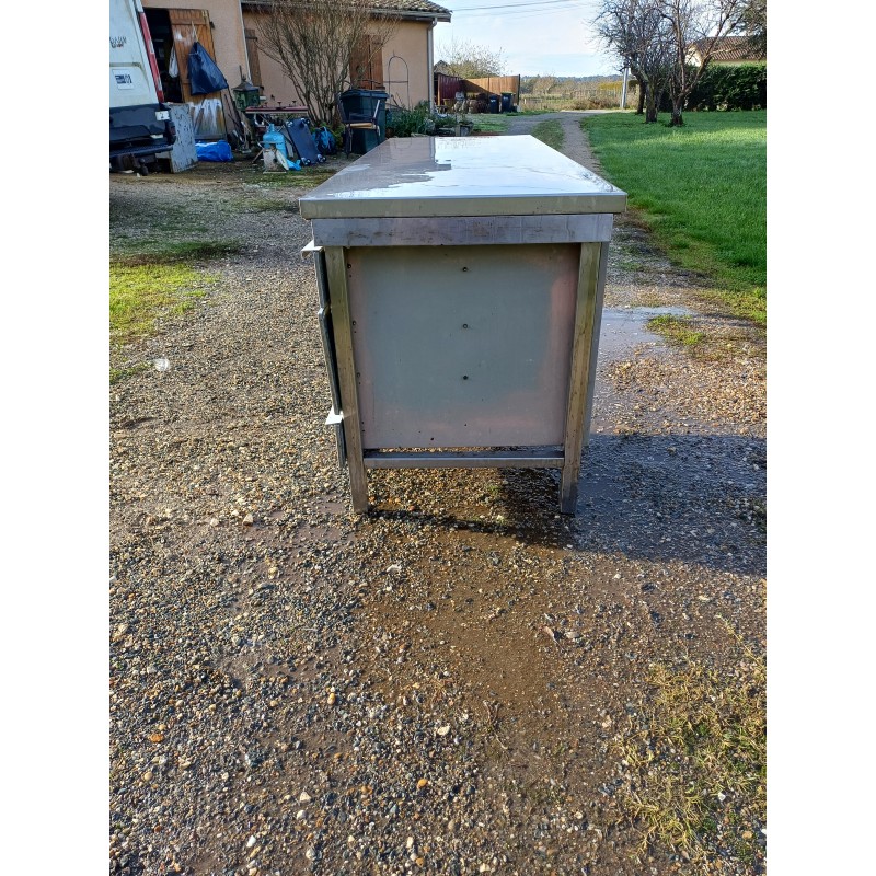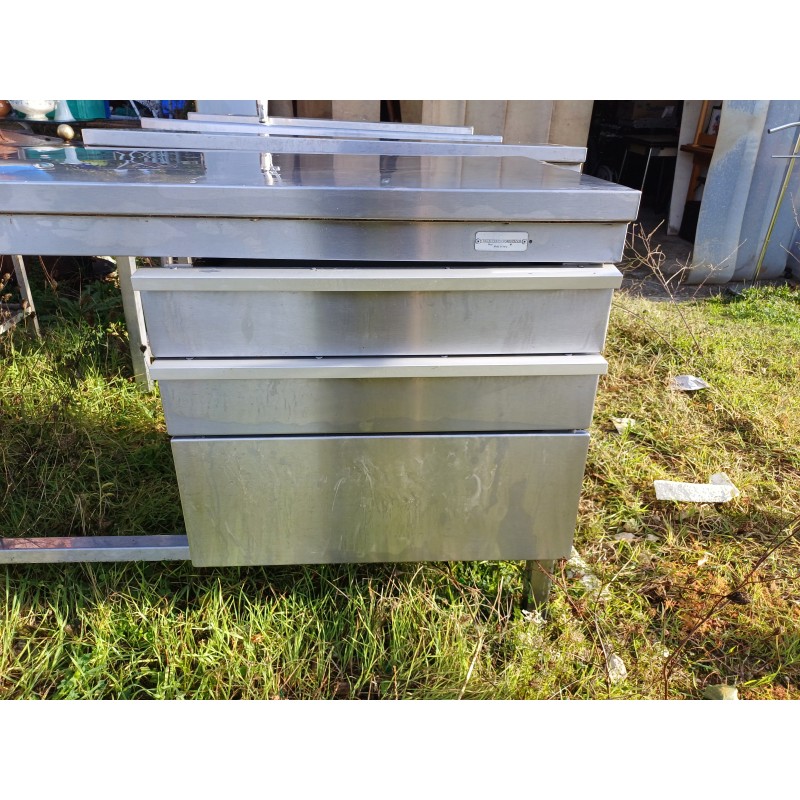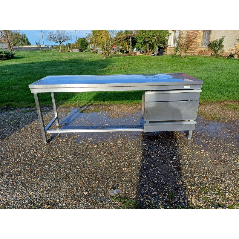 Table Inox de Collectivité avec 3 Tiroirs et Bacs Plastic , 1 étagére , Haut : 85 cm , long et larg : 210 cm sur 70 cm , , trés bon ètat ,