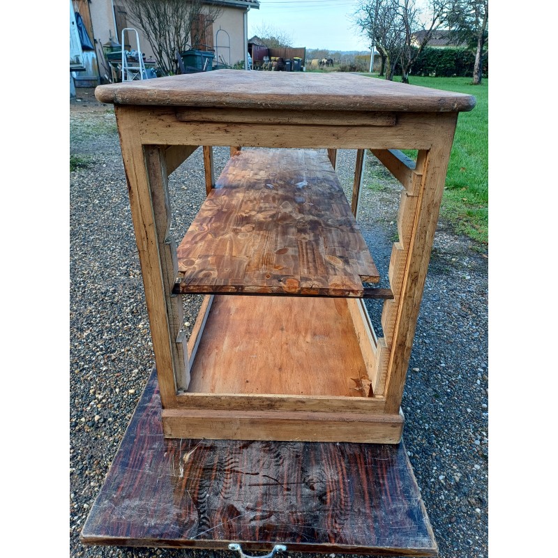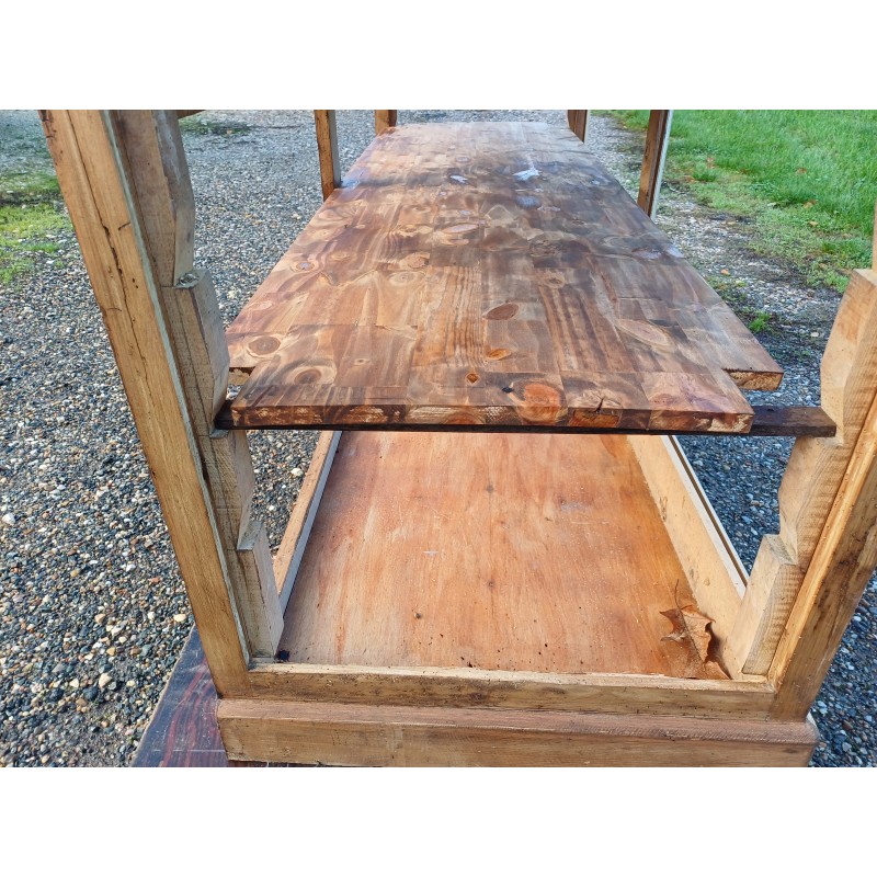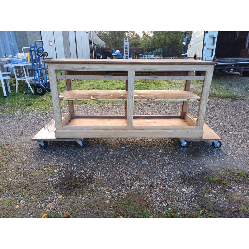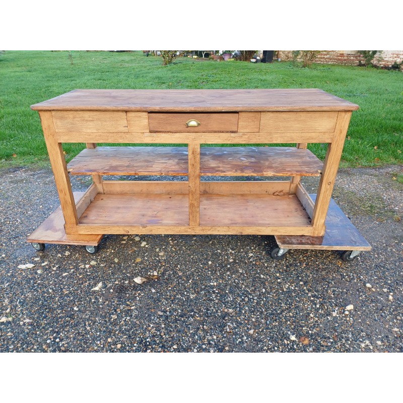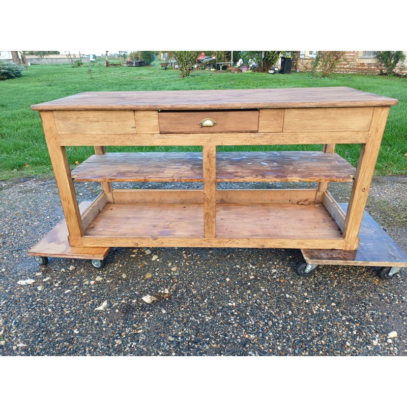 Meuble de Métier Comptoir de Magasin " Drapier " , Pin et Plateau chéne , 1 Tiroir , poignée Coquille , étagéres , Haut : 82 cm , long et larg : 170 cm sur 64 cm , trés bon ètat , dans sonjus
