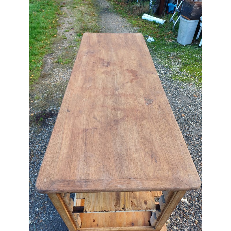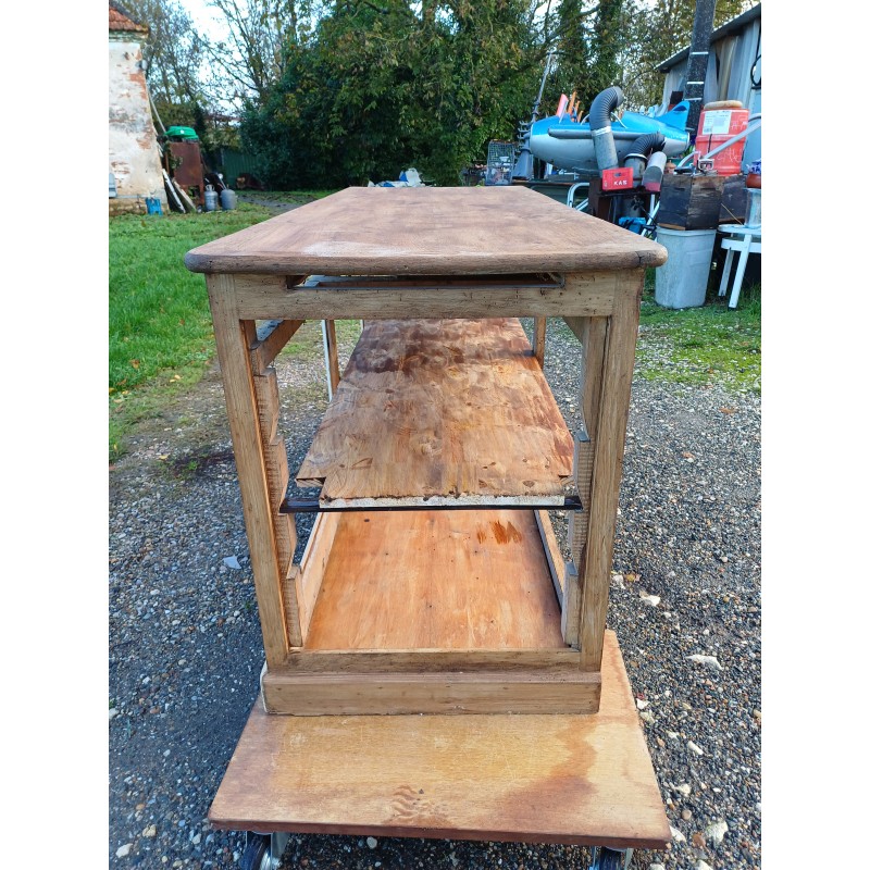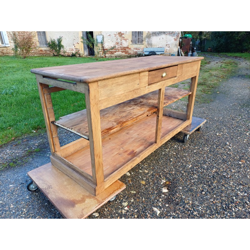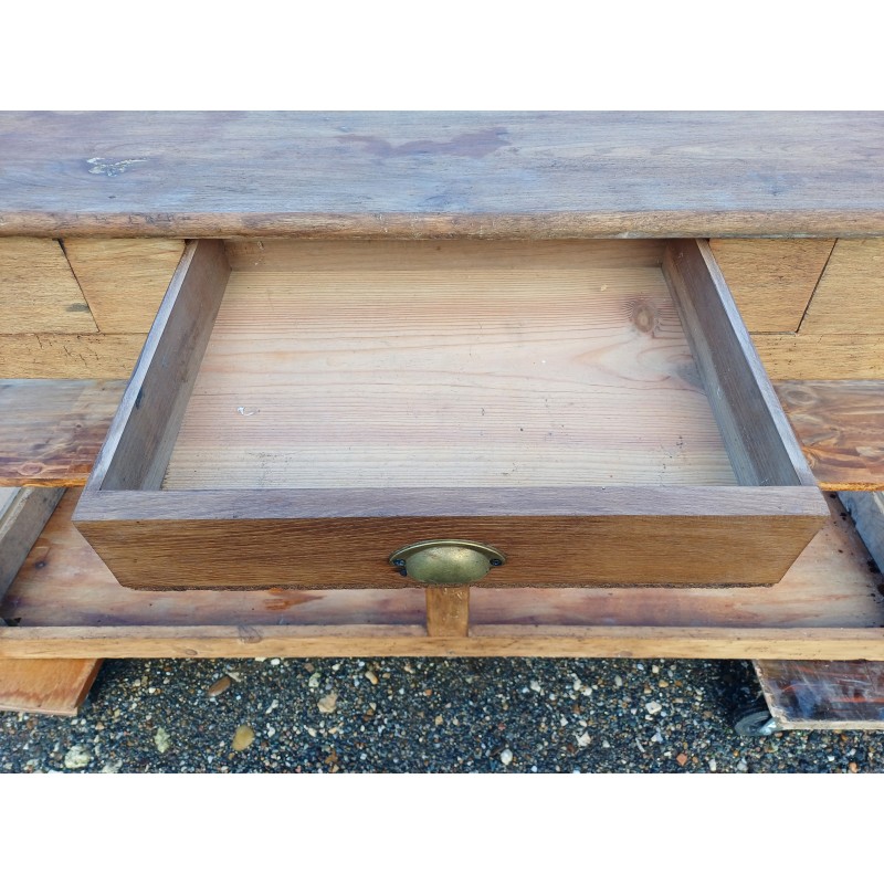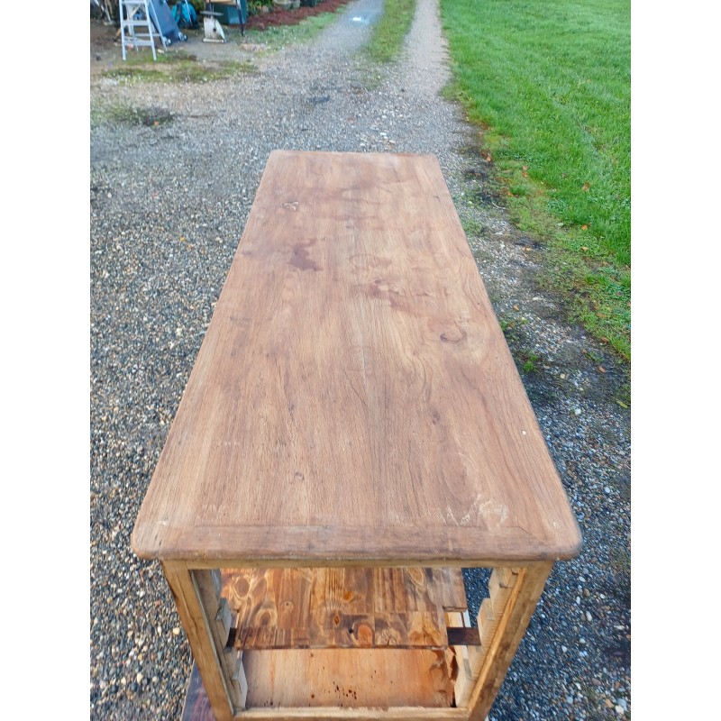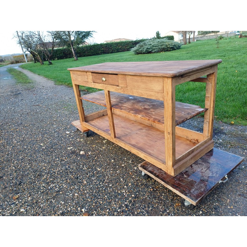Meuble de Métier Comptoir de Magasin " Drapier " , Pin et Plateau chéne , 1 Tiroir , poignée Coquille , étagéres , Haut : 82 cm , long et larg : 170 cm sur 64 cm , trés bon ètat , dans sonjus
