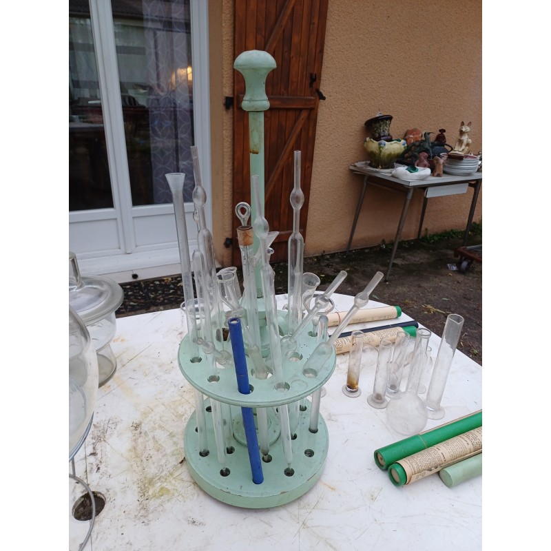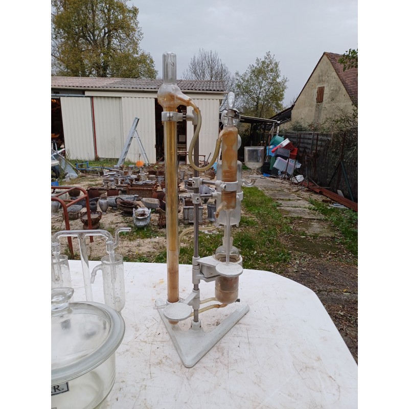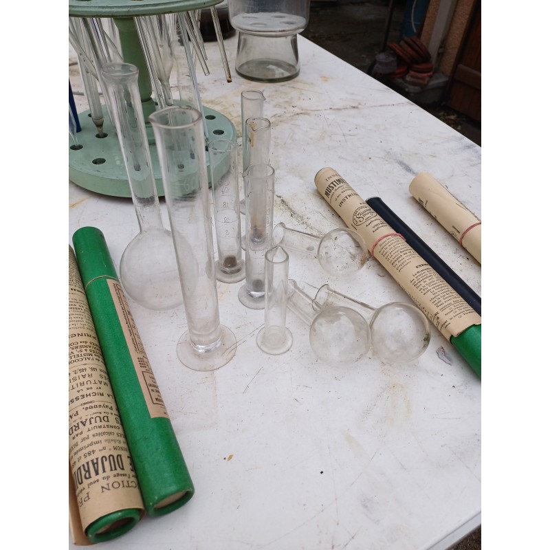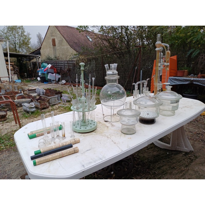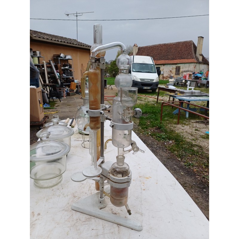 élément de Distillation de Laboratoire Verre , Pyrex , haut : 35 cm , long et larg : 30 cm sur 10 cm et Servante a Tubes de Laboratoire , Servante en bois peint verre clair et multitudes de Pipettes , doseur , Mustimètres , etc......encore emballés , le tout est en trés bon ètatlivraison pour Europe ou Monde Entier me contacter pour les frais car ceux notés dans l'encart prévu a cet effet , modifie suivant le pays ,