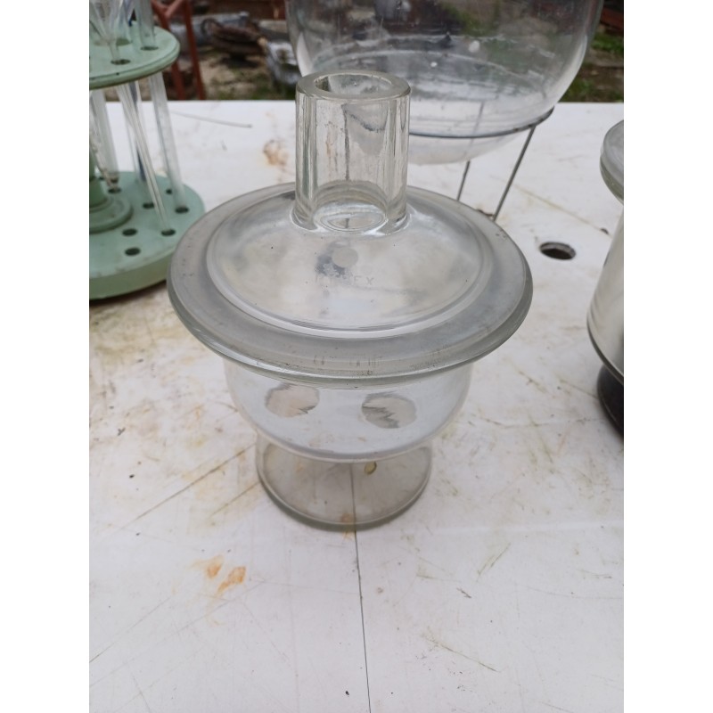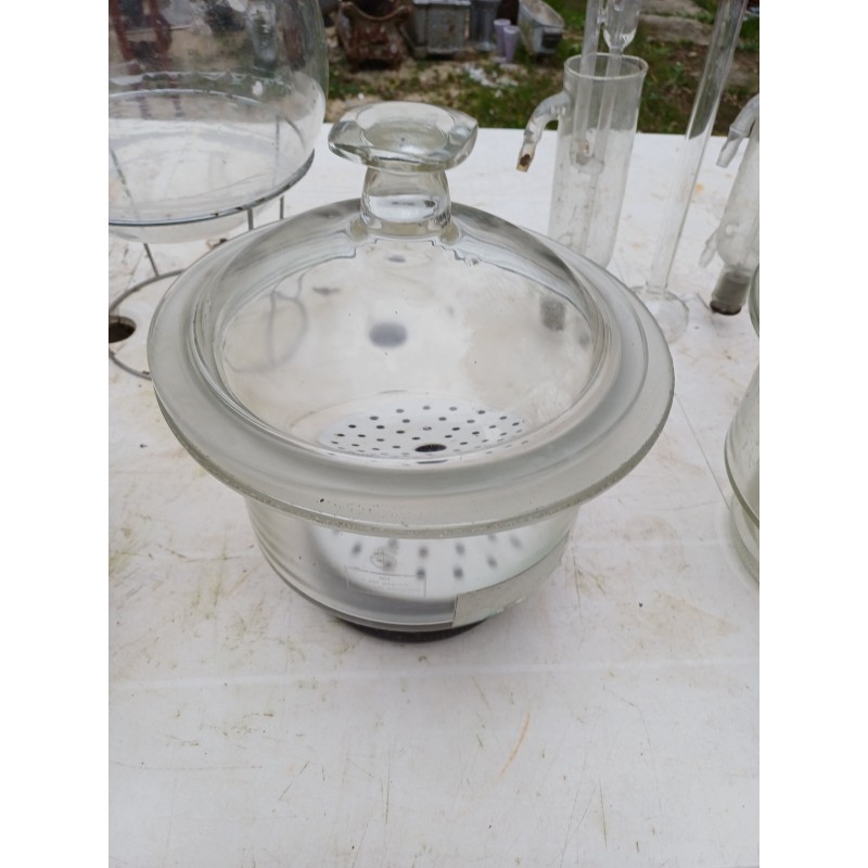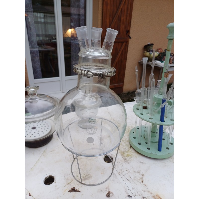 Lot d'éléments de Laboratoire en Verre , Colonne de Laboratoire Buchi , Haut : 84 cm , long et larg : 35 cm sur 35 cm , 3 Bocaux de Laboratoire Pyrex , Verre et Porcelaine , 2 de Hauteur : 32 cm , Diam : 27 cm , poids : 4,5 Kg pièce et 1 de Haut : 27 cm , Diam : 20 cm , poids : 2,3 Kg , Bocal Rond de Laboratoire SCHMIZO ( Suisse ) PYREX ( France ) , haut : 45 cm , diam : 27 cm ,