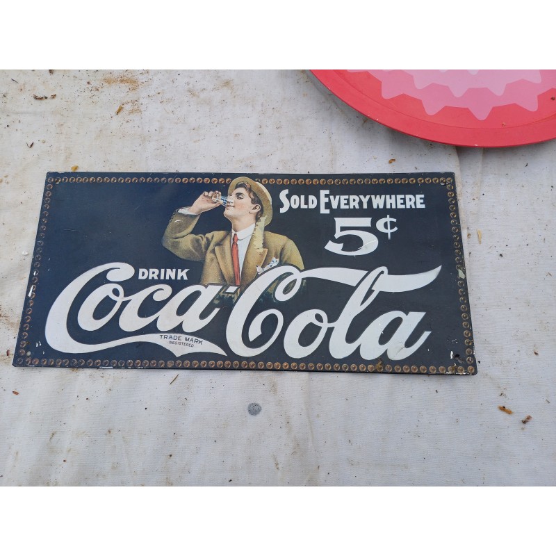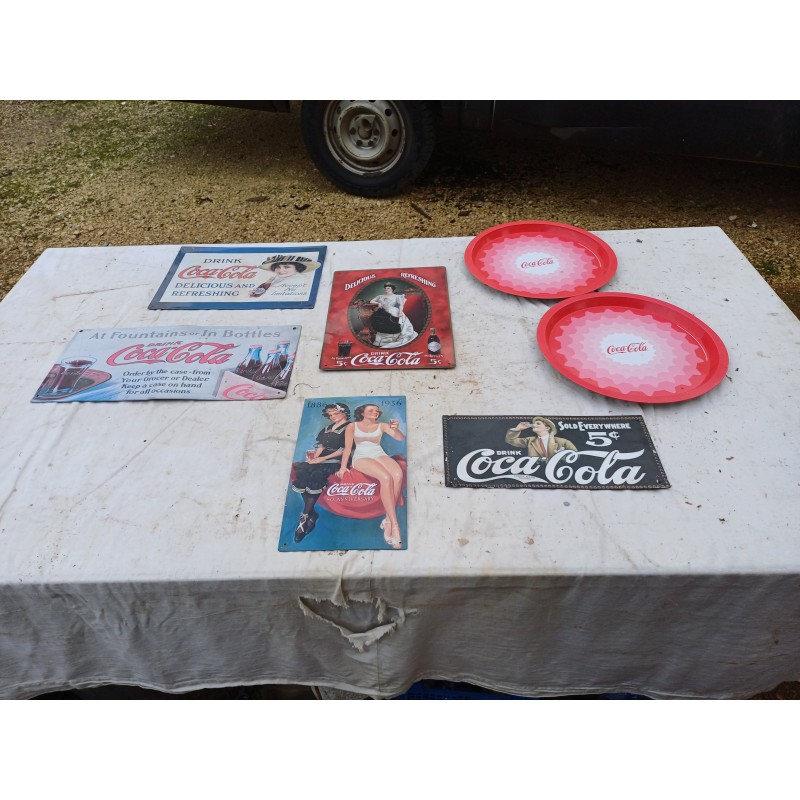 Lot Publicitaire Coca Cola , 5 Toles Publicitaire , Dimensions : 45 cm sur 22 cm en Métal et 2 Plateau Rond métal aussi , Diam : 32 cm , trés bon ètat