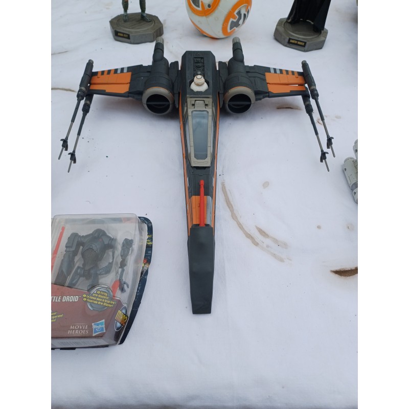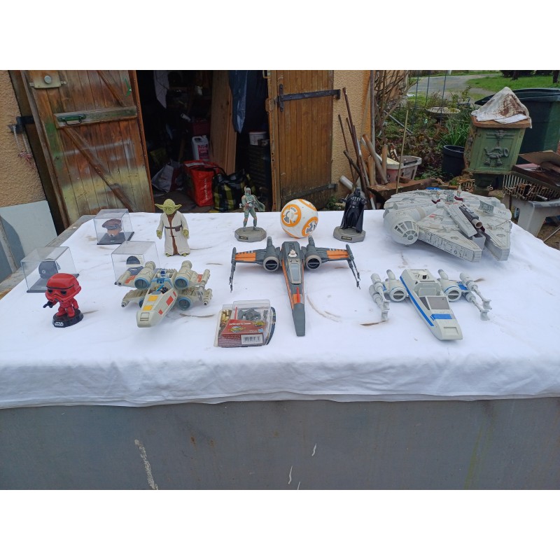 Lot Stars Wars , 4 Vaisseaux , 5 Personnages Stars Wars avec Dark Vador Haut : 18 cm , Diam : 10,5 cm , Vaisseau , Malandorian , Obi Wan et le petit rouge je sais pas , il a pas l'air commode , trés bon ètat