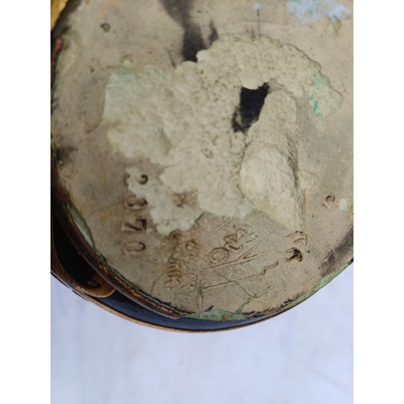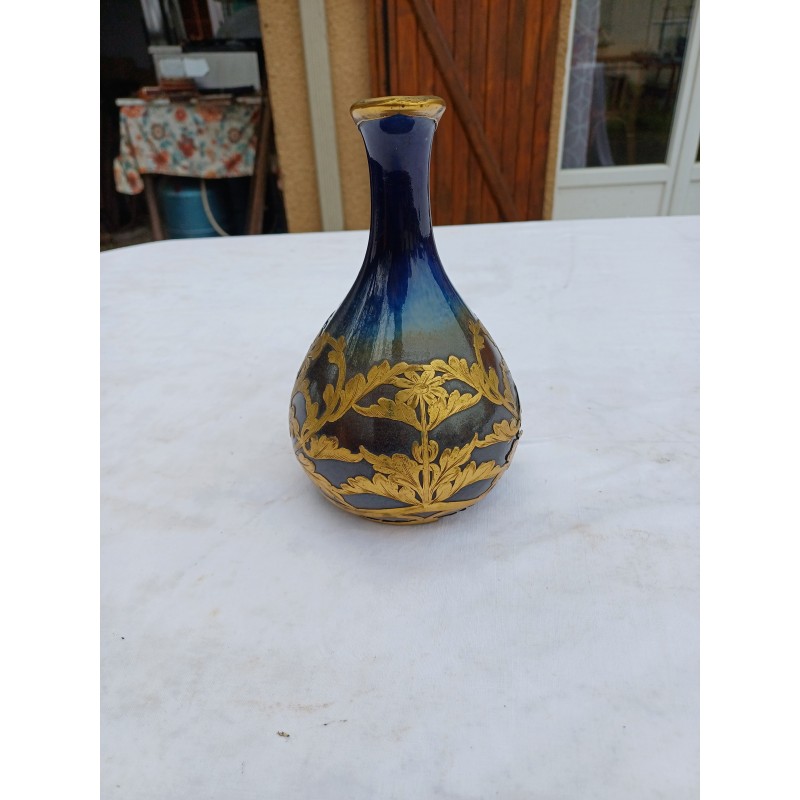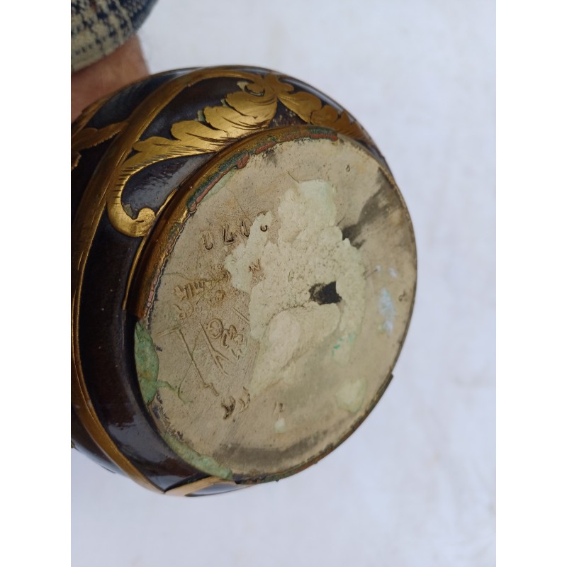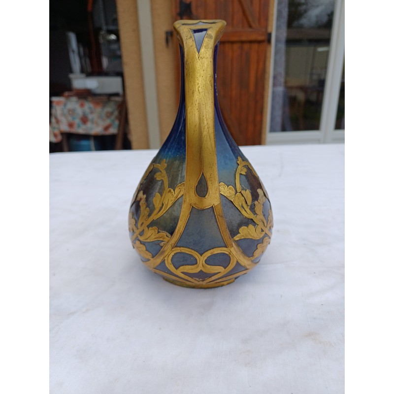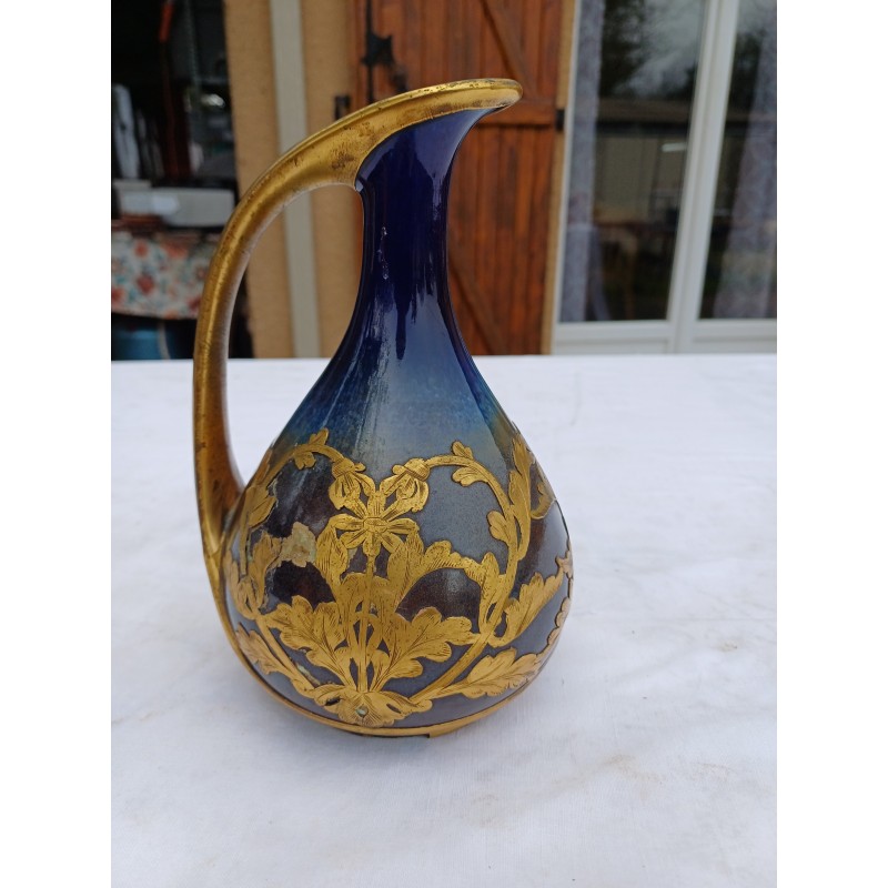 Pichet en céramique émmaillé de Peter Bremens , Manufacture : Merkelbach , décor laiton ciselé a décors de feuillages , Haut : 20 cm , long et larg : 13 cm sur 12 cm , poids : 670 g , Bon ètat