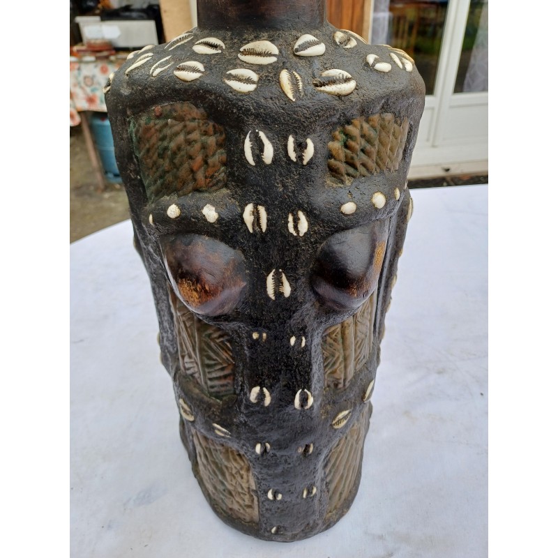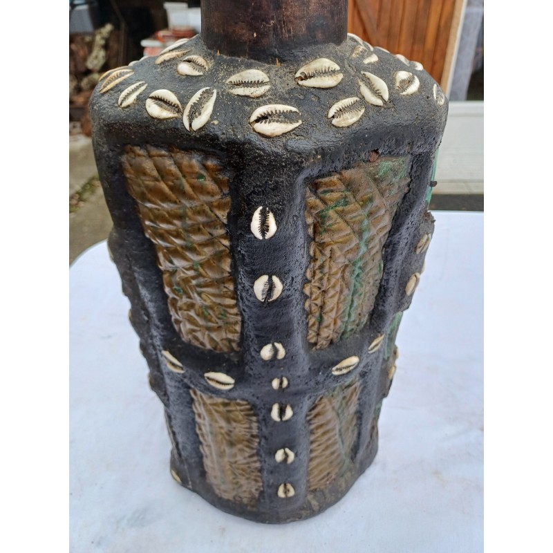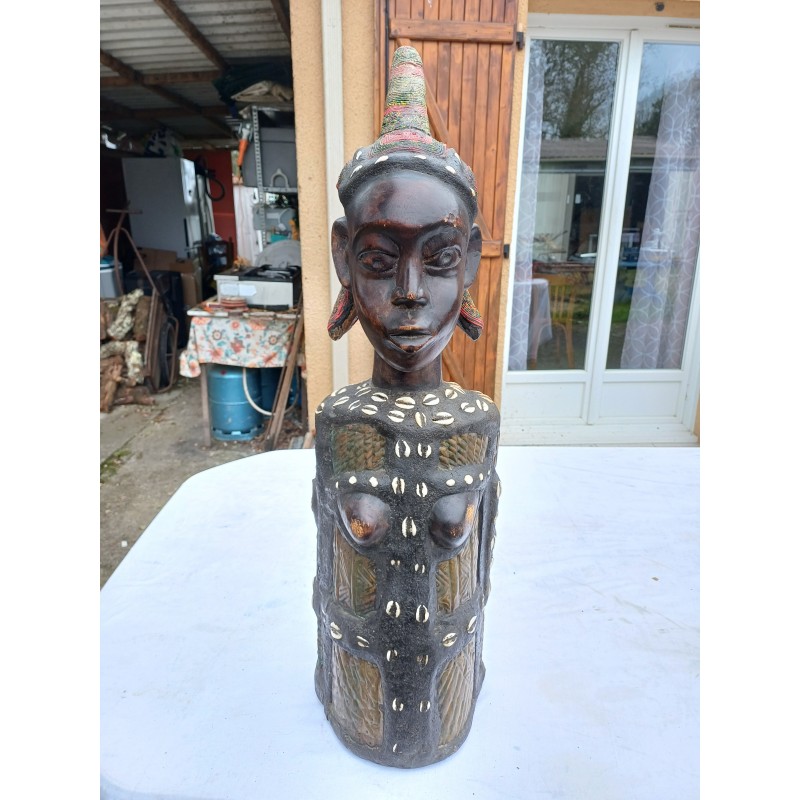 Statue Africaine Femme Bois , laiton , Perles , Coquillages , Haut : 74 cm , Long et larg : 21,5 cm sur 20 cm , poids : 6,2 Kg , trés bon ètat