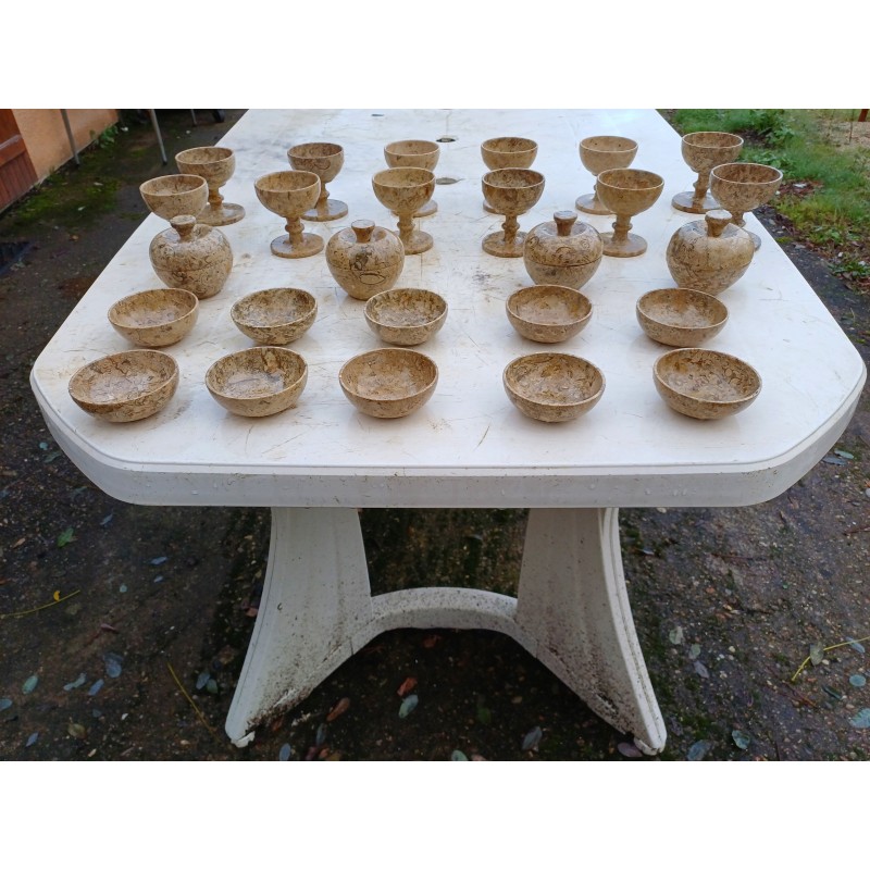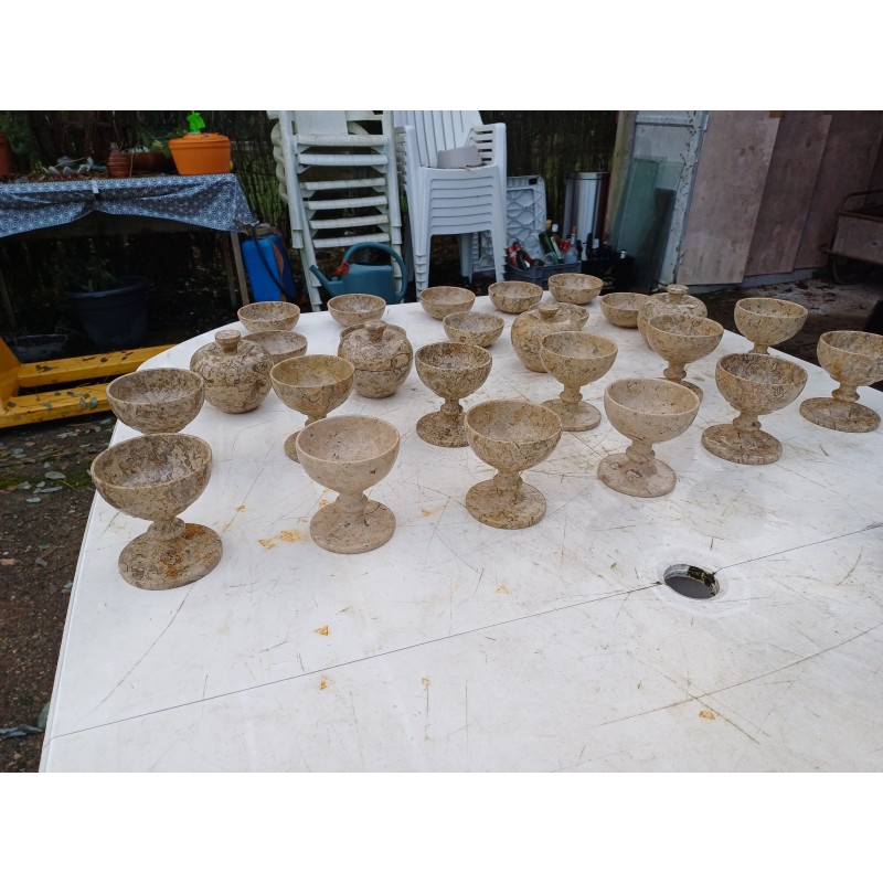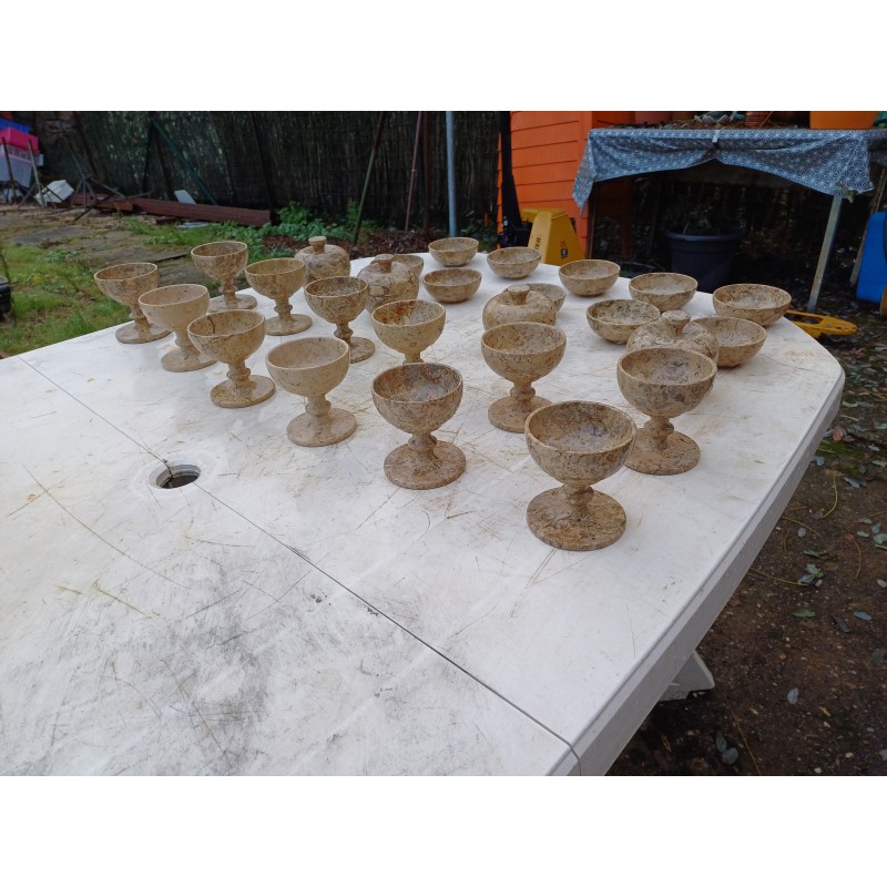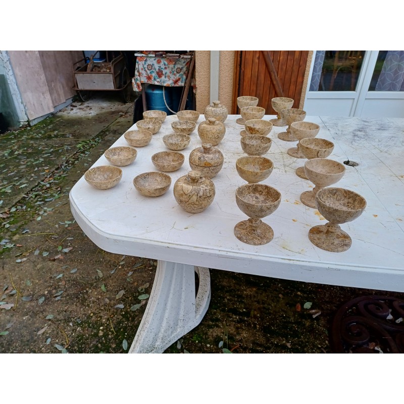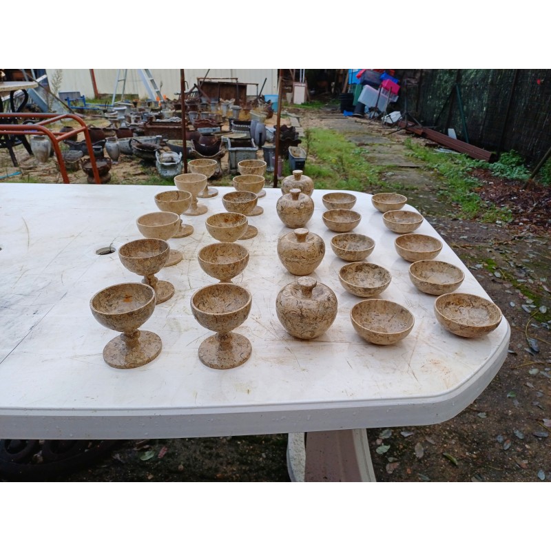 Service en Travertin , 12 Coupes Haut 10 cm , Diam : 9 cm , 4 Récipients avec couvercles Haut 10 cm , Diam : 10 cm et 10 Bols , Haut 4 cm , Diam : 10 cm , poids Total : 12 Kg , très bon état ,