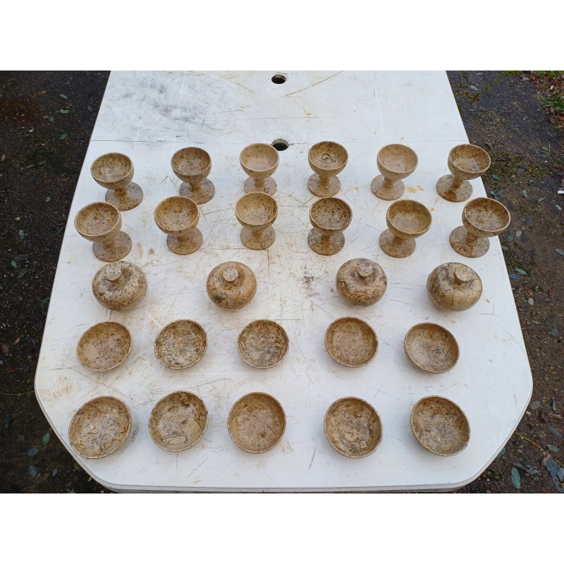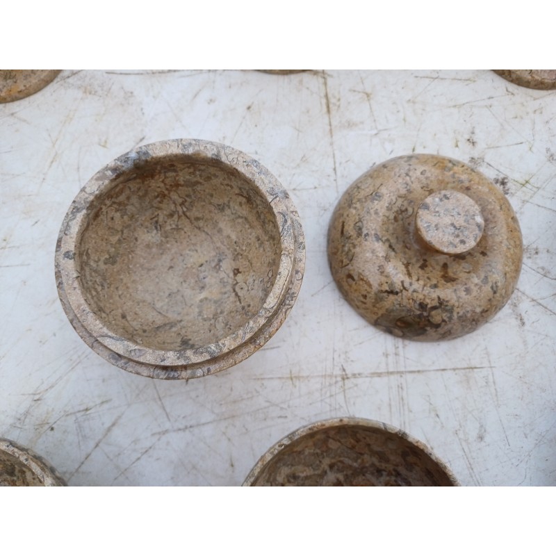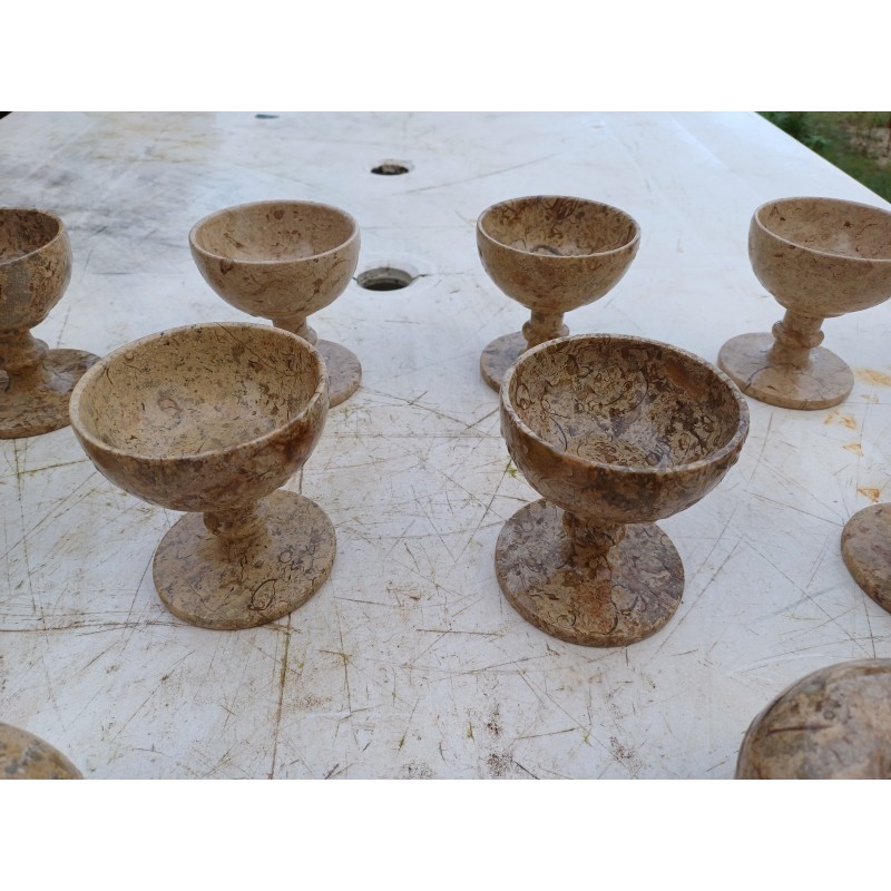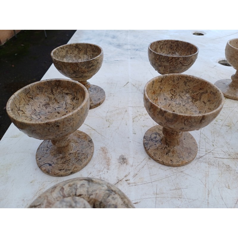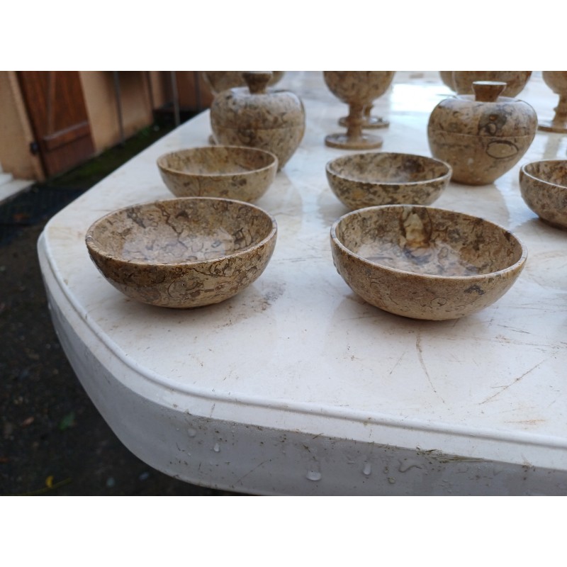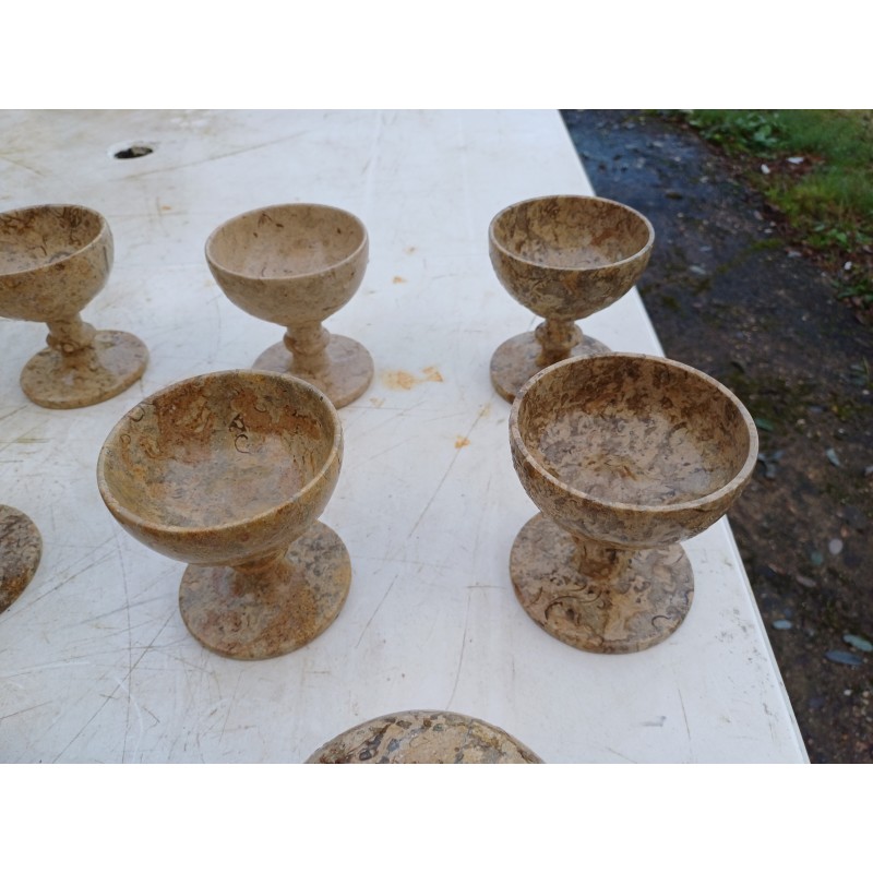Service en Travertin , 12 Coupes Haut 10 cm , Diam : 9 cm , 4 Récipients avec couvercles Haut 10 cm , Diam : 10 cm et 10 Bols , Haut 4 cm , Diam : 10 cm , poids Total : 12 Kg , très bon état ,