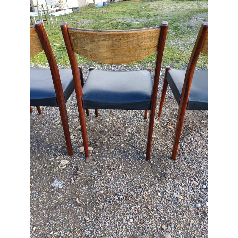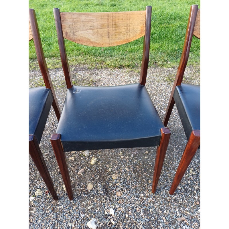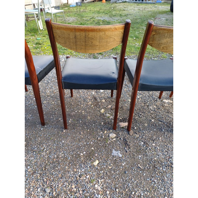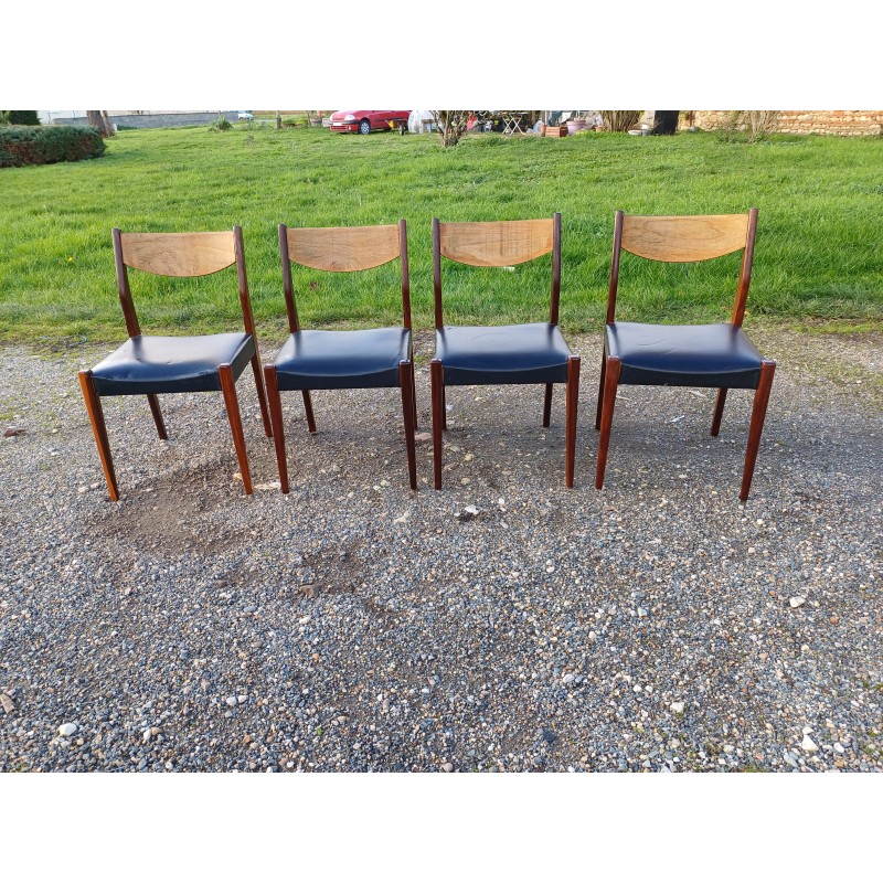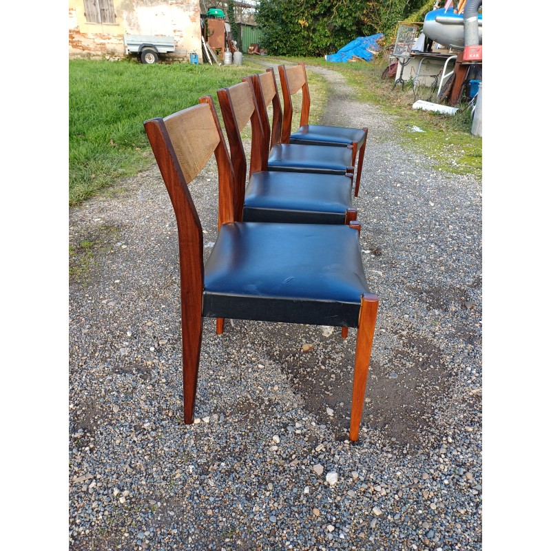 4 Chaises Baumann Vintage des Années 60 , Bois Exotique et Hètre , Assise Skai Noir , Haut : 83 cm , Haut d'assise : 46 cm , long et larg : 51 cm sur 46 cm , trés bon ètat sauf un accroc au Skai sur l'une des chaises