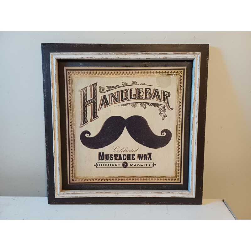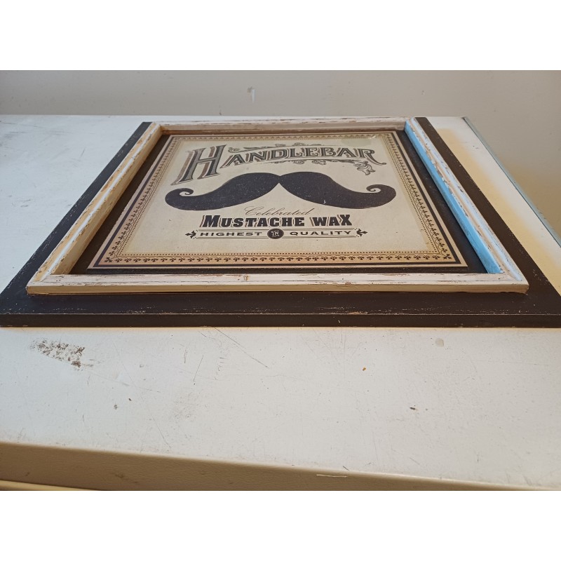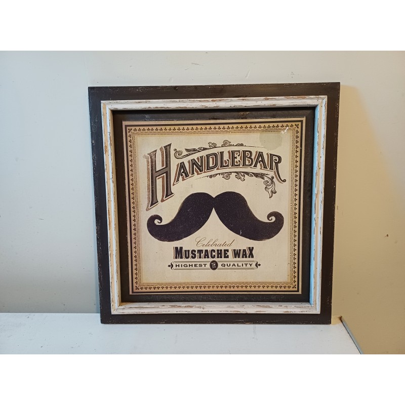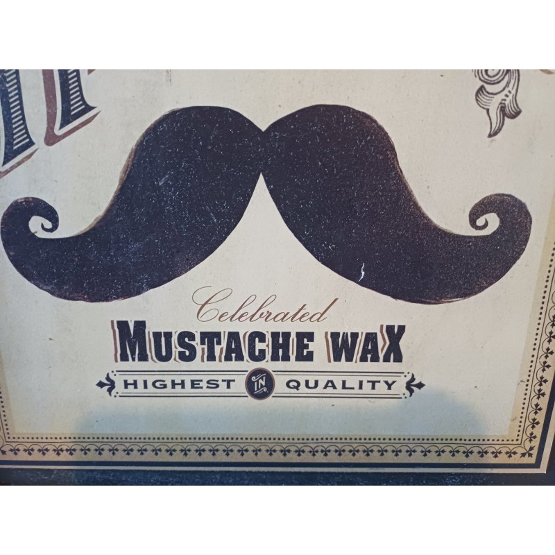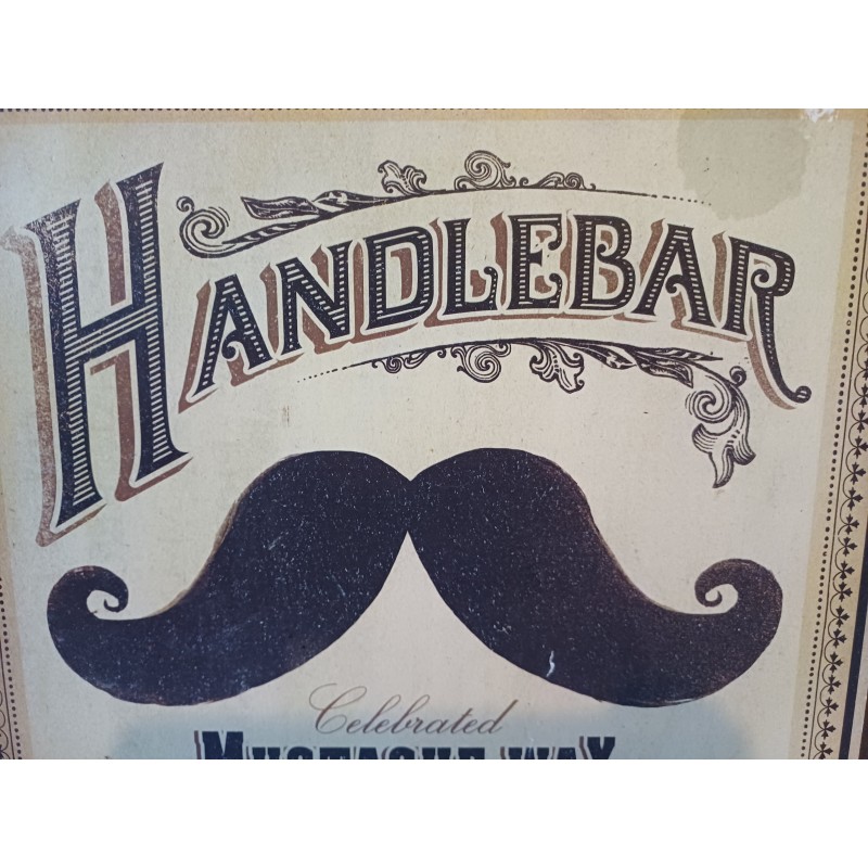 Décoration Publicitaire Coiffeur Barbier en Bois , Handlebar Mustache Wax , Imprèssion Papier , long et larg : 51 cm sur 51 cm , épaisseur : 2 cm , poids : 1,6 Kg , très bon état