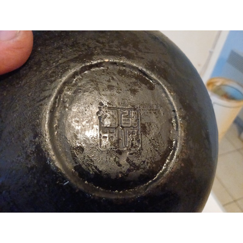 Théière Tetsu-Kyusu en fonte de grande taille de la célèbre marque japonaise Nanbu Tekki, Iwachu, avec un motif Arare pointillé dans un style Kambin ("chauffe-saké) plat et large avec intérieur émaillé antirouille et passoire amovible en acier inoxydable. , signée en creux , Haut : 17 cm avec poignée Haut : 10 cm avec couvercle , long et larg : 23 cm sur 20 cm , poids : 2,7 Kg , très bon état