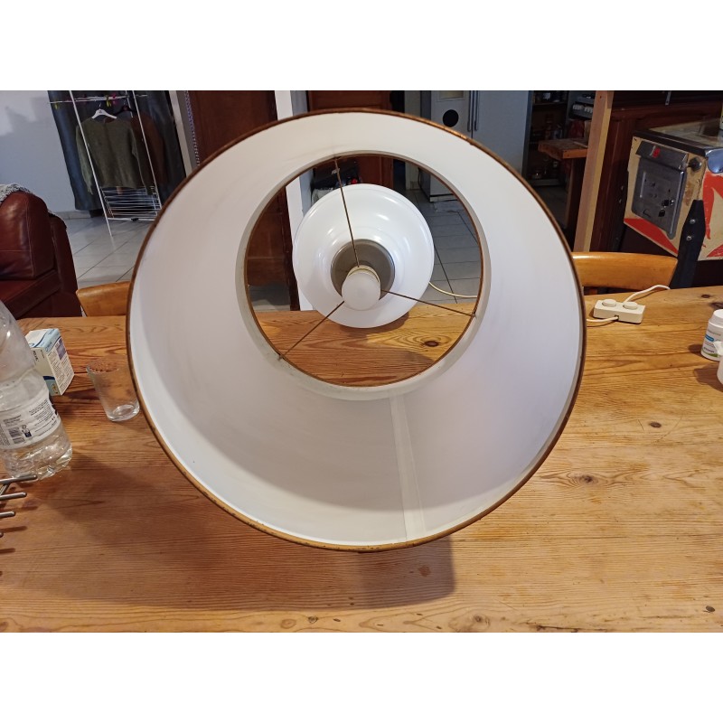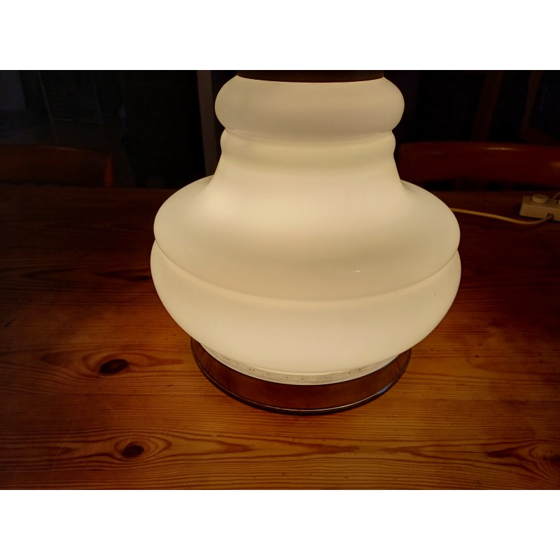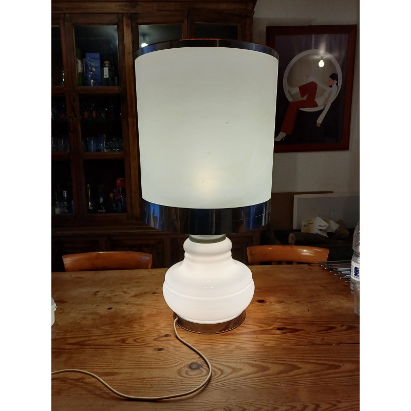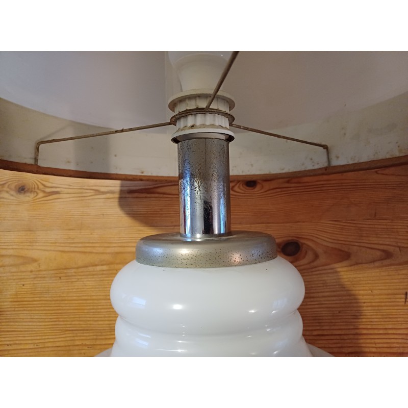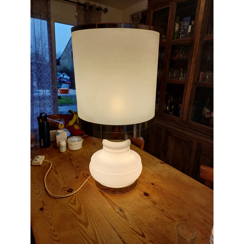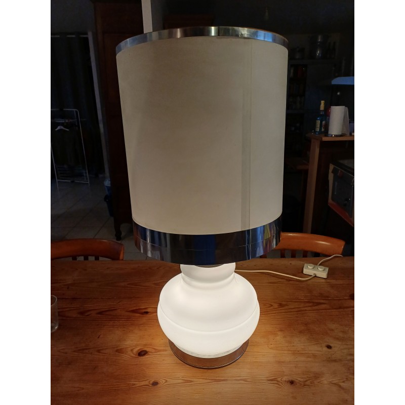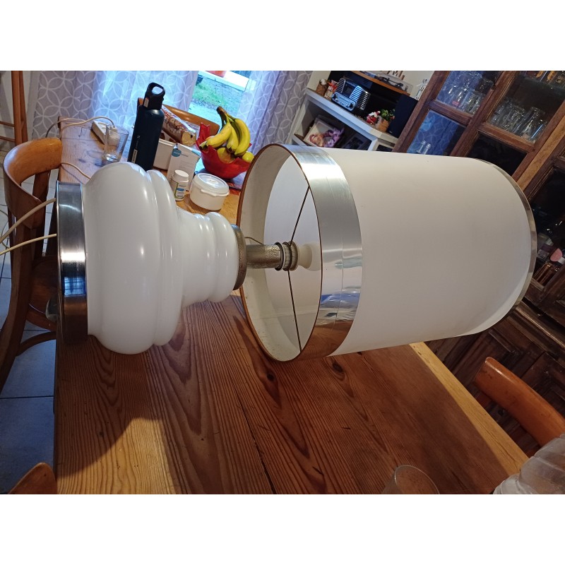 Lampe Vintage des Années 70 Opaline Blanche , cerclage chromé sur l'opaline er sur l'abat jour d'origine en tissus plastifié , interrupteur a 2 boutons pressions allumant soit l'opaline soit l'abat jour ou les 2 en mème temps ; Haut : 80 cm , Haut opaline : 30 cm , diam : 40 cm , poids : 3 Kg , très bon état