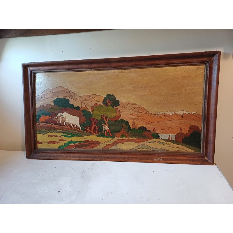 Tableau Bois Peinture vernie signée Clavere , Façon Marqueterie , Haut : 62 cm , long et larg : 114 cm sur 3,5 cm , très bon état