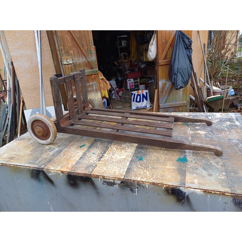 Diable Ancien Bois et Roues en Gomme dure , Long : 120 cm , Haut et Larg : 50 cm sur 44 cm , poids : 7 Kg , très bon état
