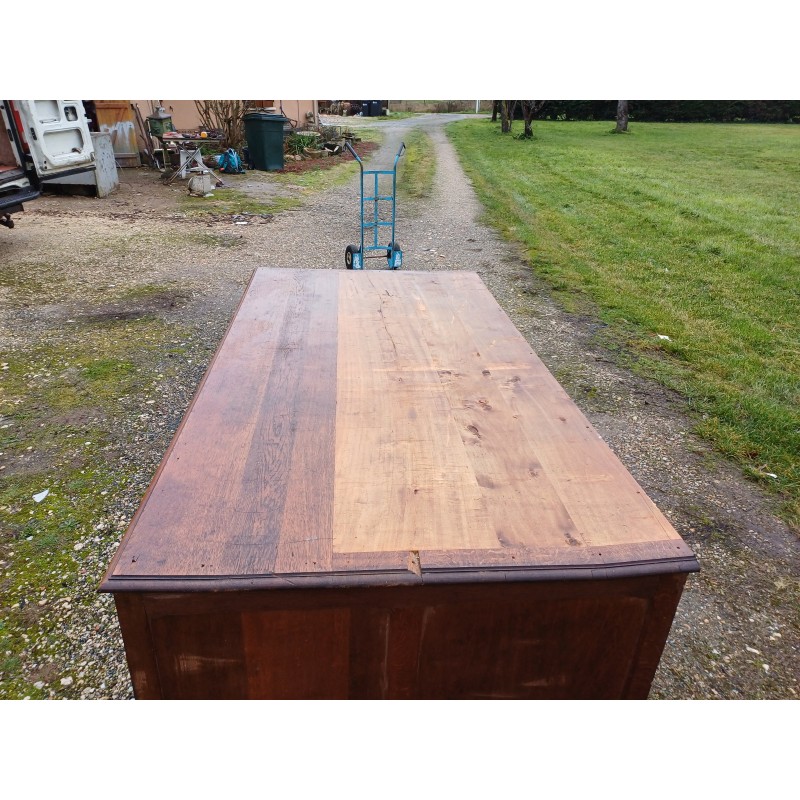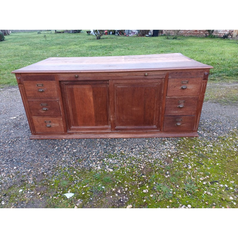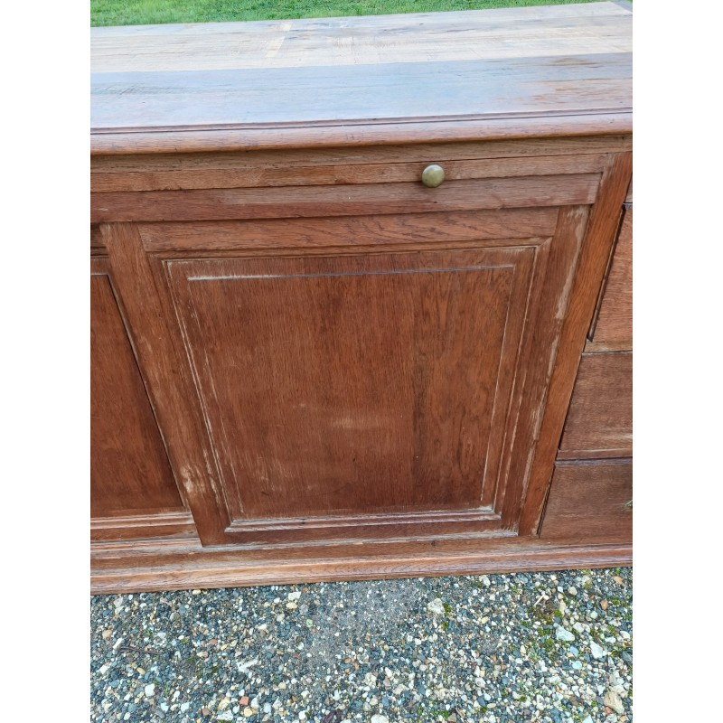 Meuble de Métier Table de Drapier Chéne Année 30 , 6 Tiroirs , 1 Planchette en son Milieu , 2 Portes coulissantes , Rangement , Poignées Coquille laiton , Haut : 85 cm , long et larg : 210 cm sur 109 cm , très bon état , Facultatif possède son Haut si besoin , voir dernière photo de l'annonce