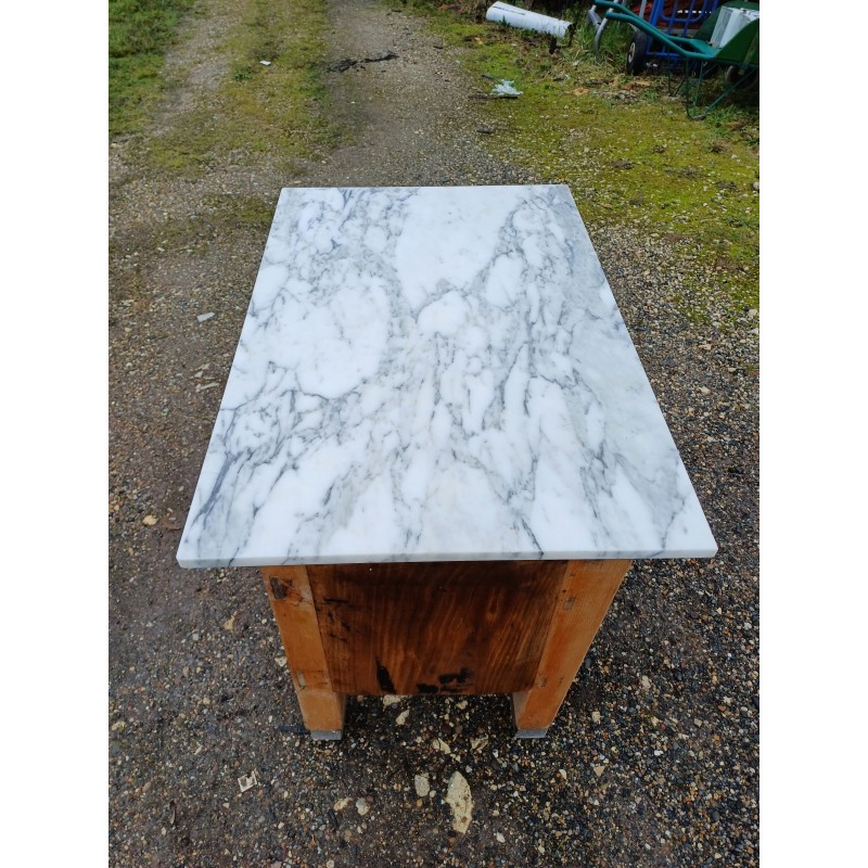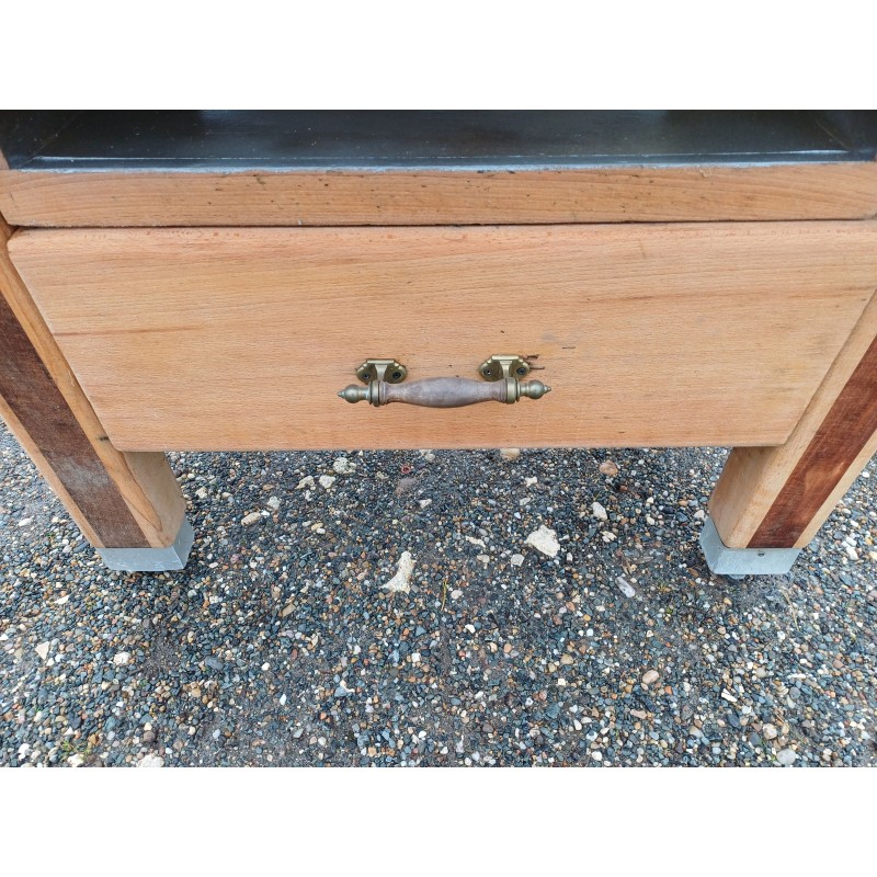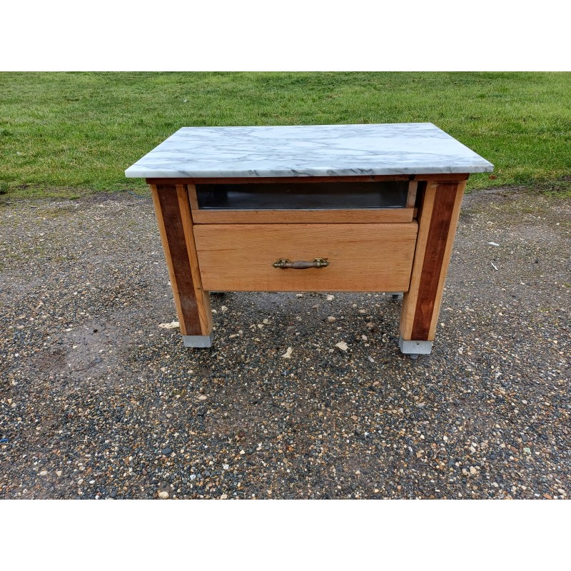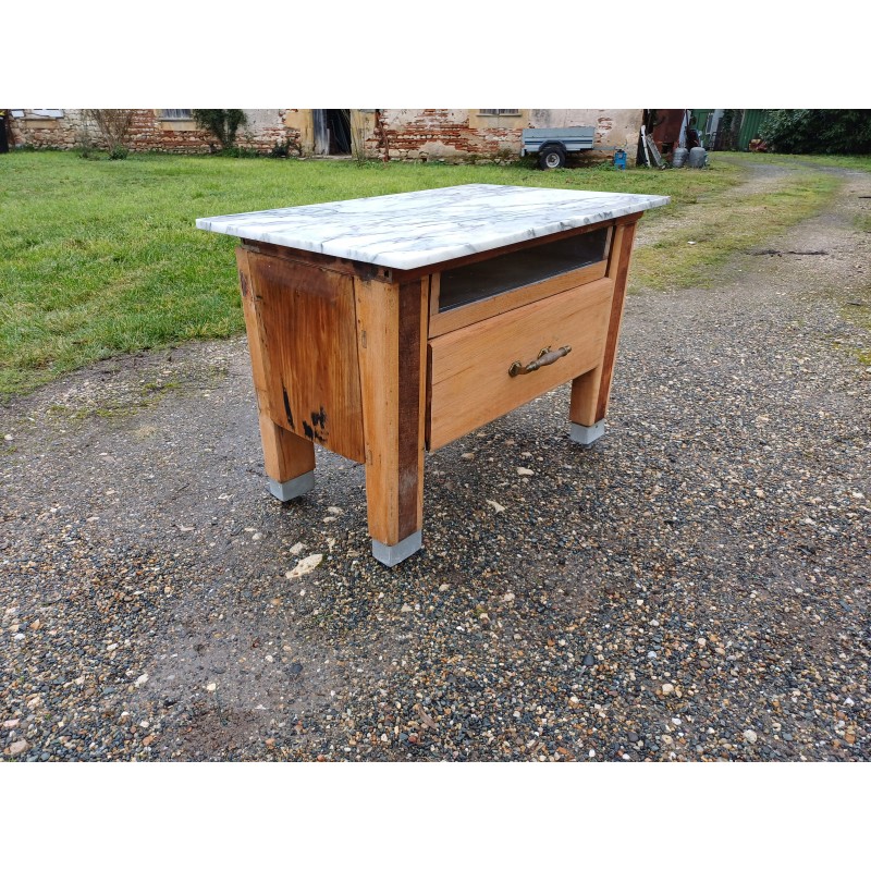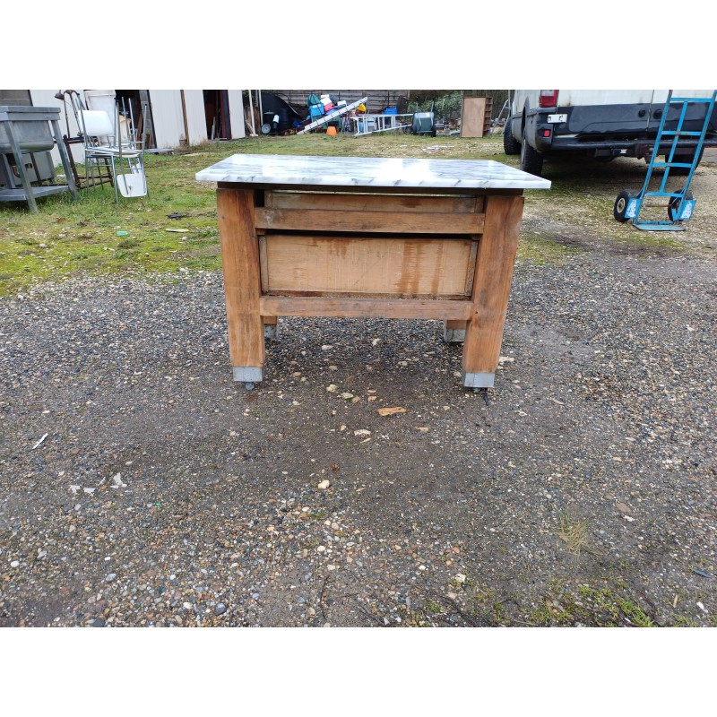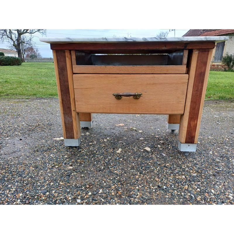 Billot de Cuisine Bois et Marbre , 1 Grand Tiroir + 1 Tiroir Niche , Bois Chéne et Acajou , Poignée Bronze , Haut : 75 cm , long et larg : 102 cm sur 66 cm , trés bon ètat