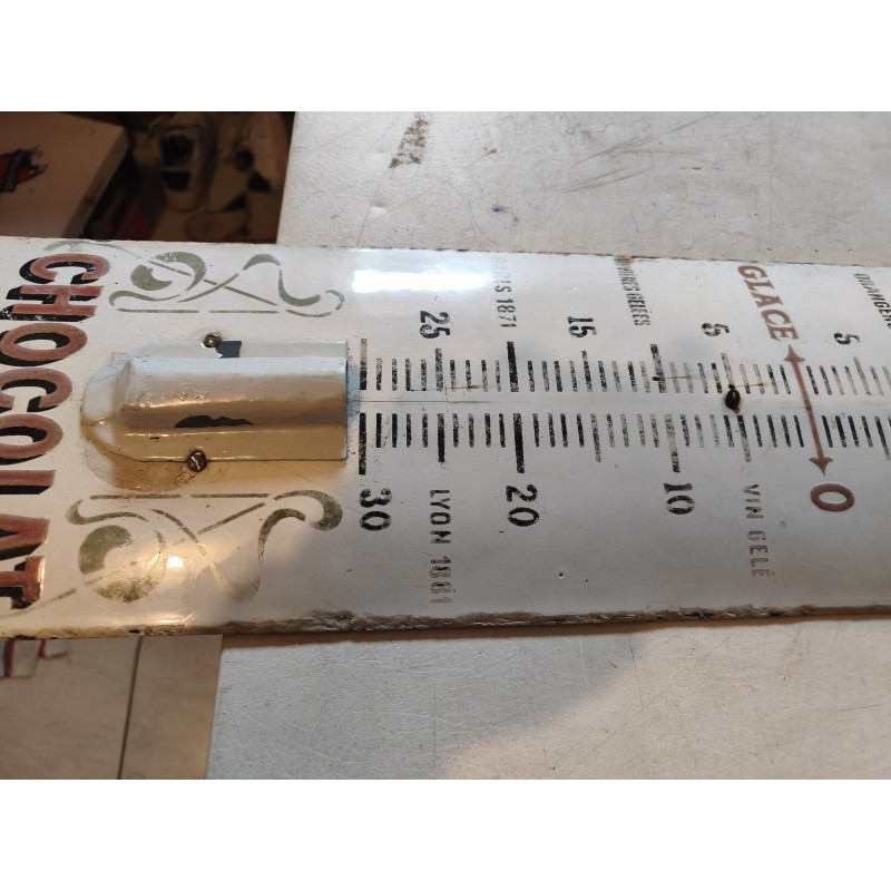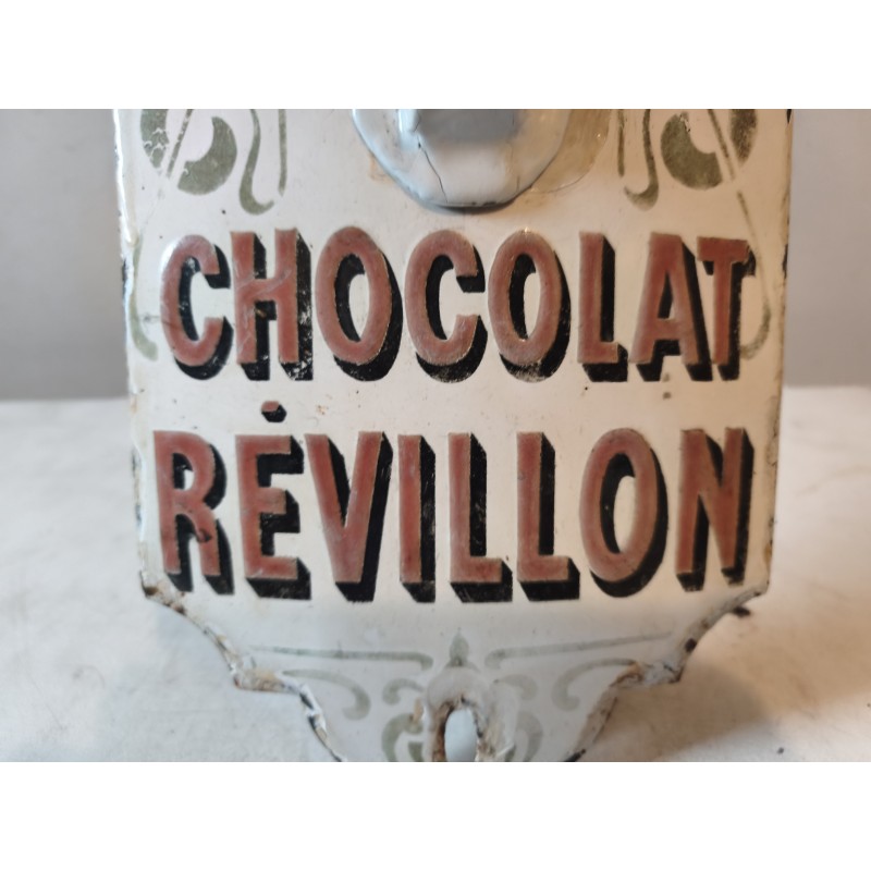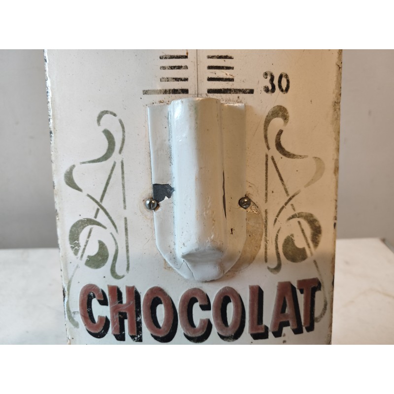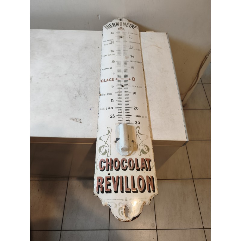 Plaque émaillée Chocolat Révillon , Haut : 95 cm , long et larg : 19 cm sur 4 cm , Bombée , poids : 2,3 Kg , Bon état général mais le thermomètre et manquant